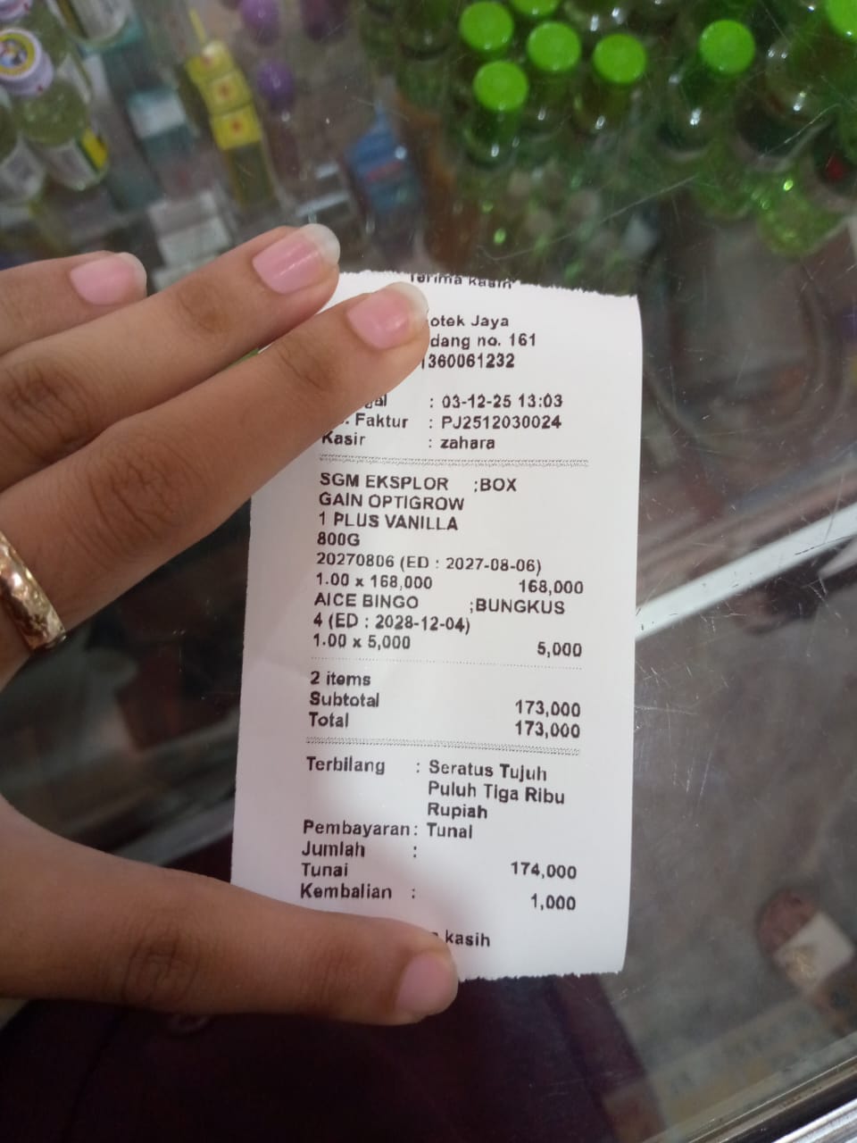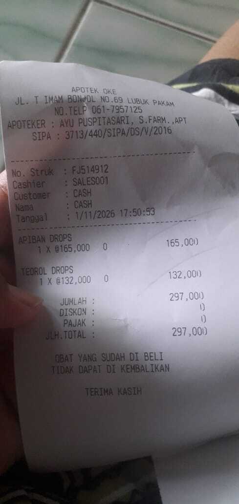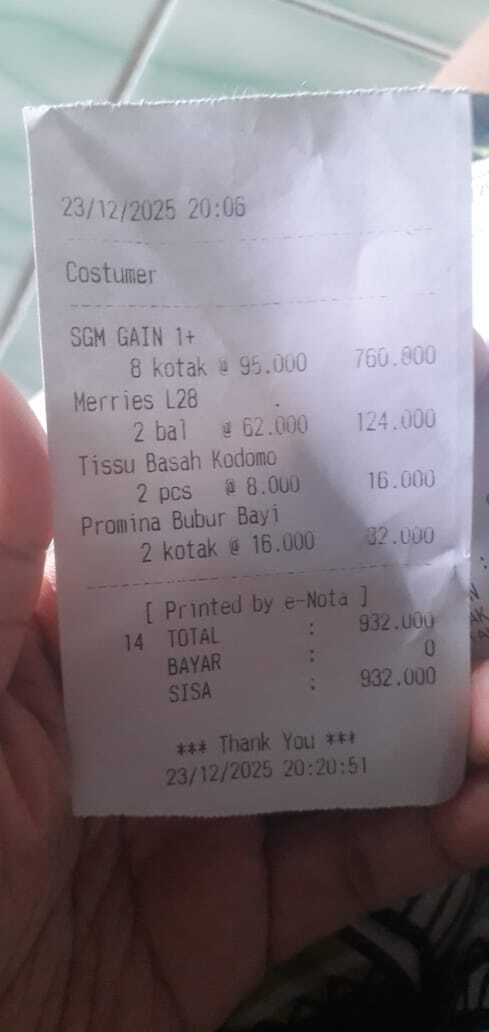 Dana digunakan untuk 1. SGM gain ungu 11× Rp95.000 = Rp1.045.000 2. Pampers meries 4 ball Rp248.000 3. Bubur bayi 4 kotak Rp64.000 4. Tisue basah 4 bungkus Rp32.000 5. Vitamin apiban Rp165.000 6. Vitamin teorol Rp132.000 7. Bola terapi tangan 2 buah Rp87.0002026-01-14 10:33:06