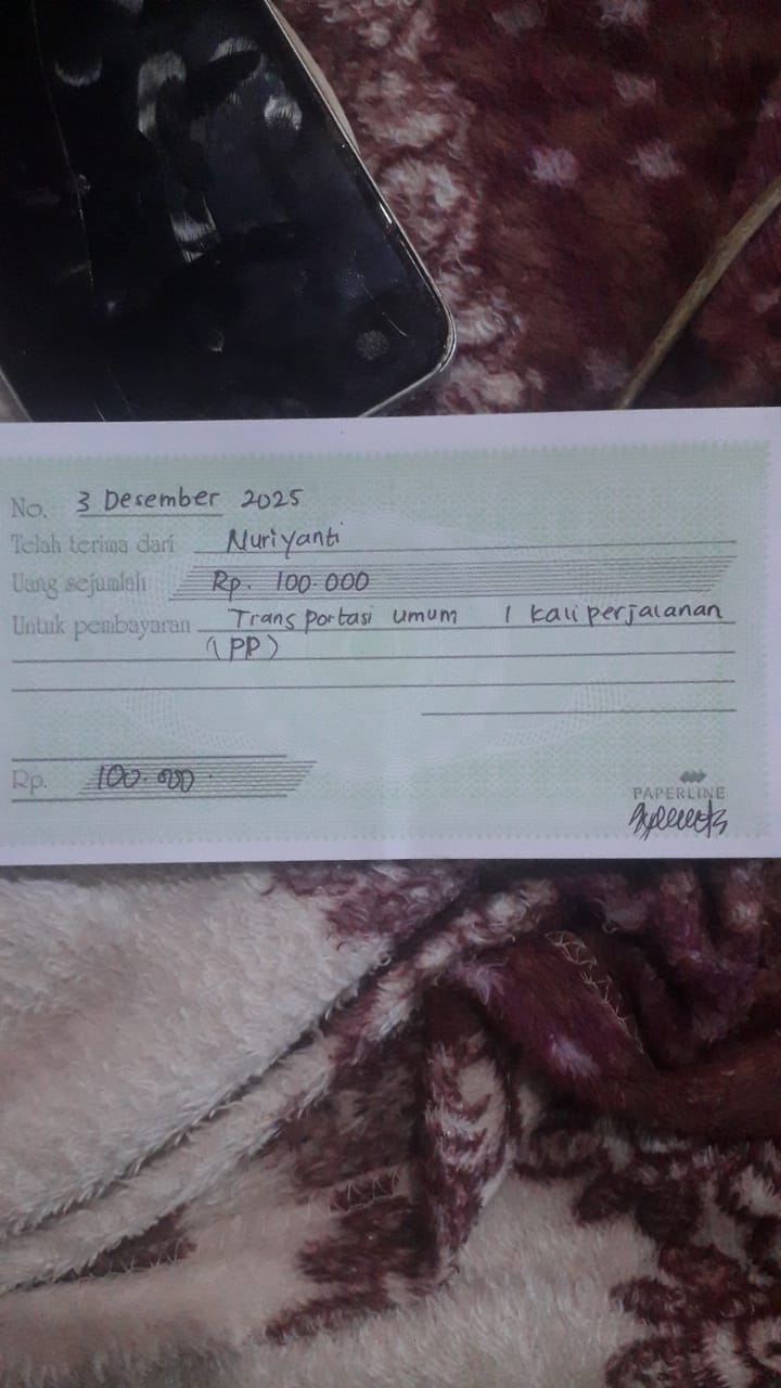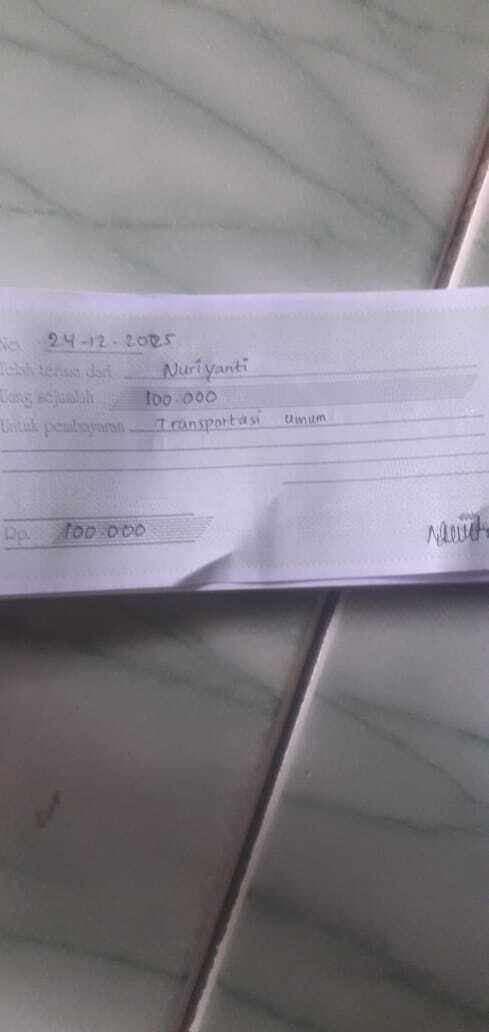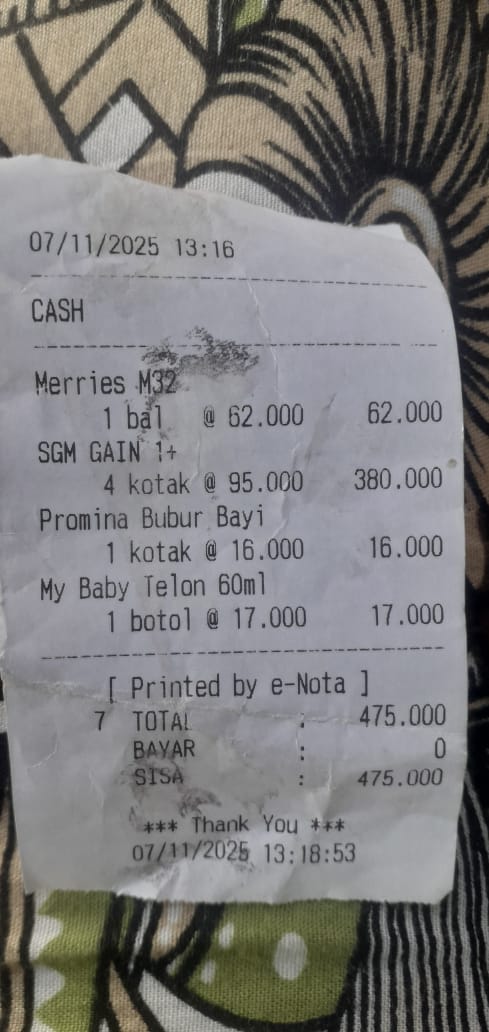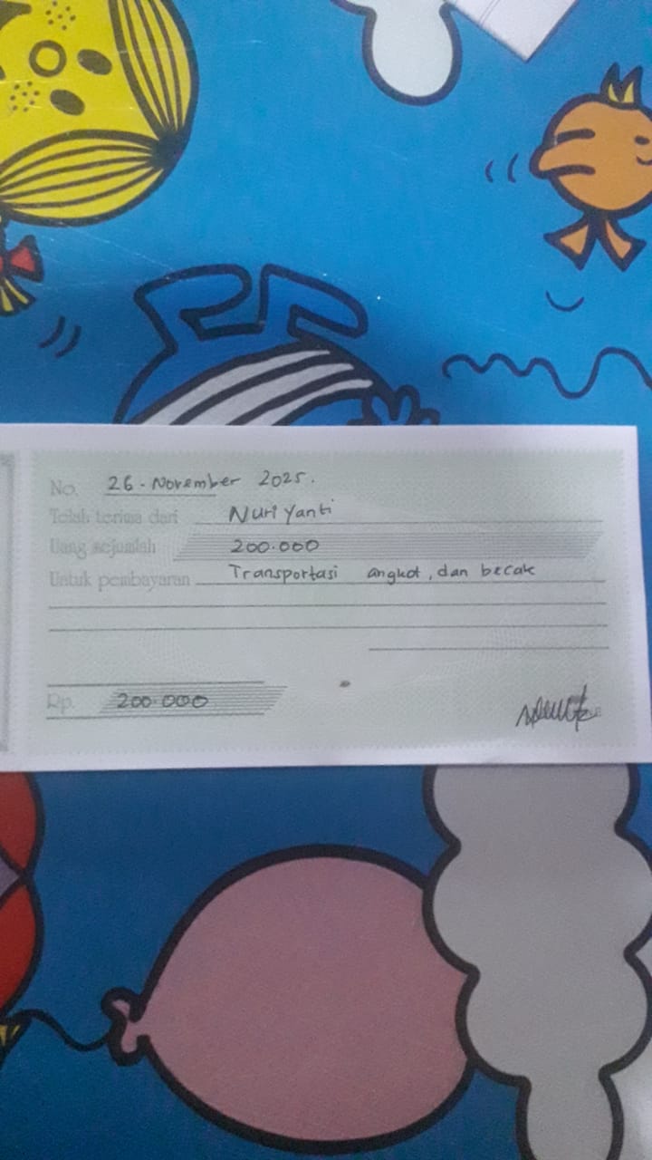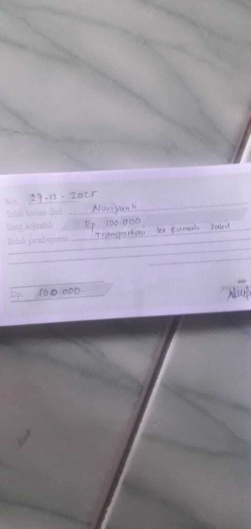 Dana digunakan untuk 1. Susu sgm gain 400 gr Rp120.000 2. Pampers meries ukuran M.isi 32 Rp62.000 3. Bubur bayi Rp16.000 4. Transportasi umum Kontrol ke RS Rp176.0002025-12-01 09:39:27