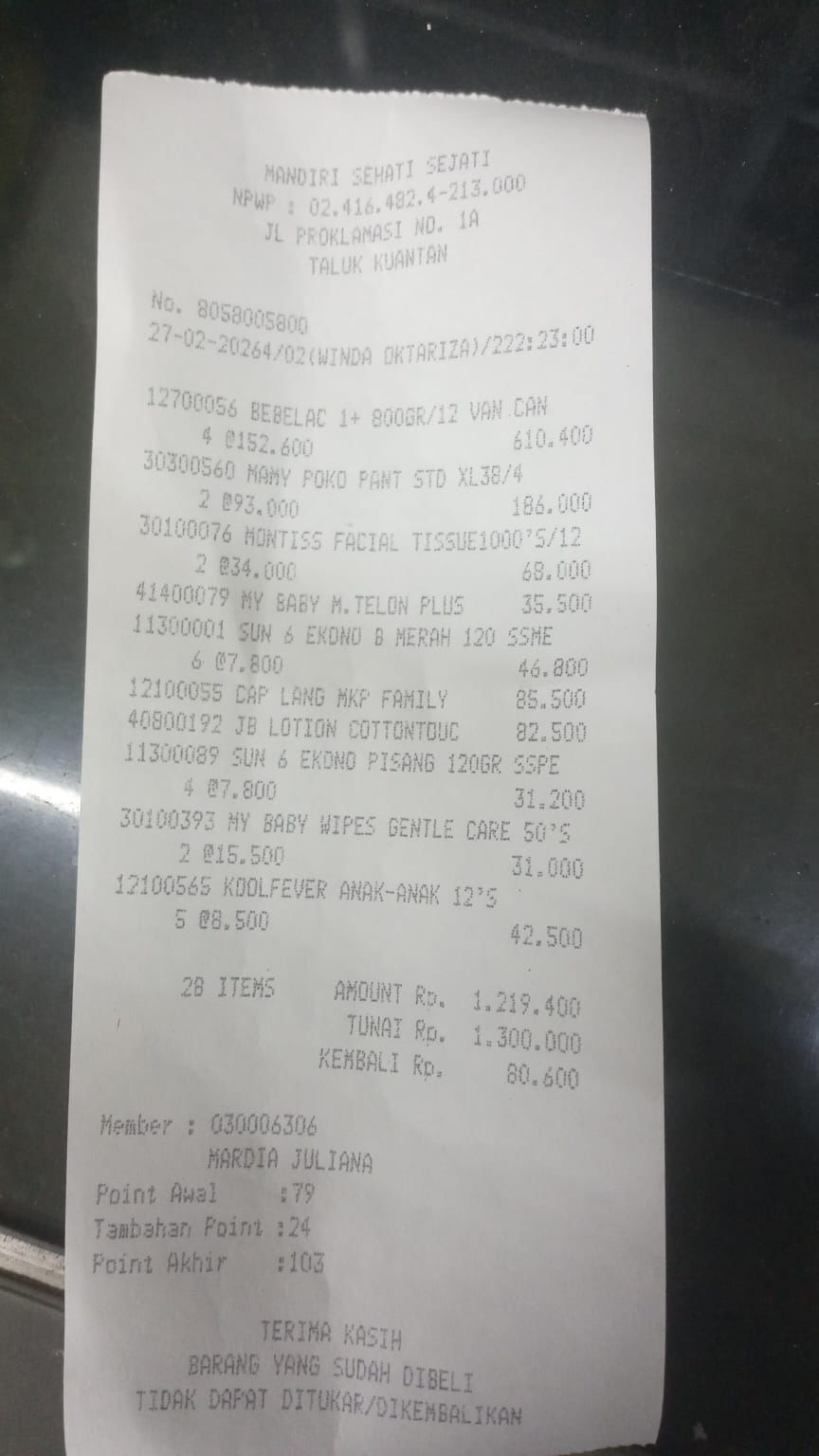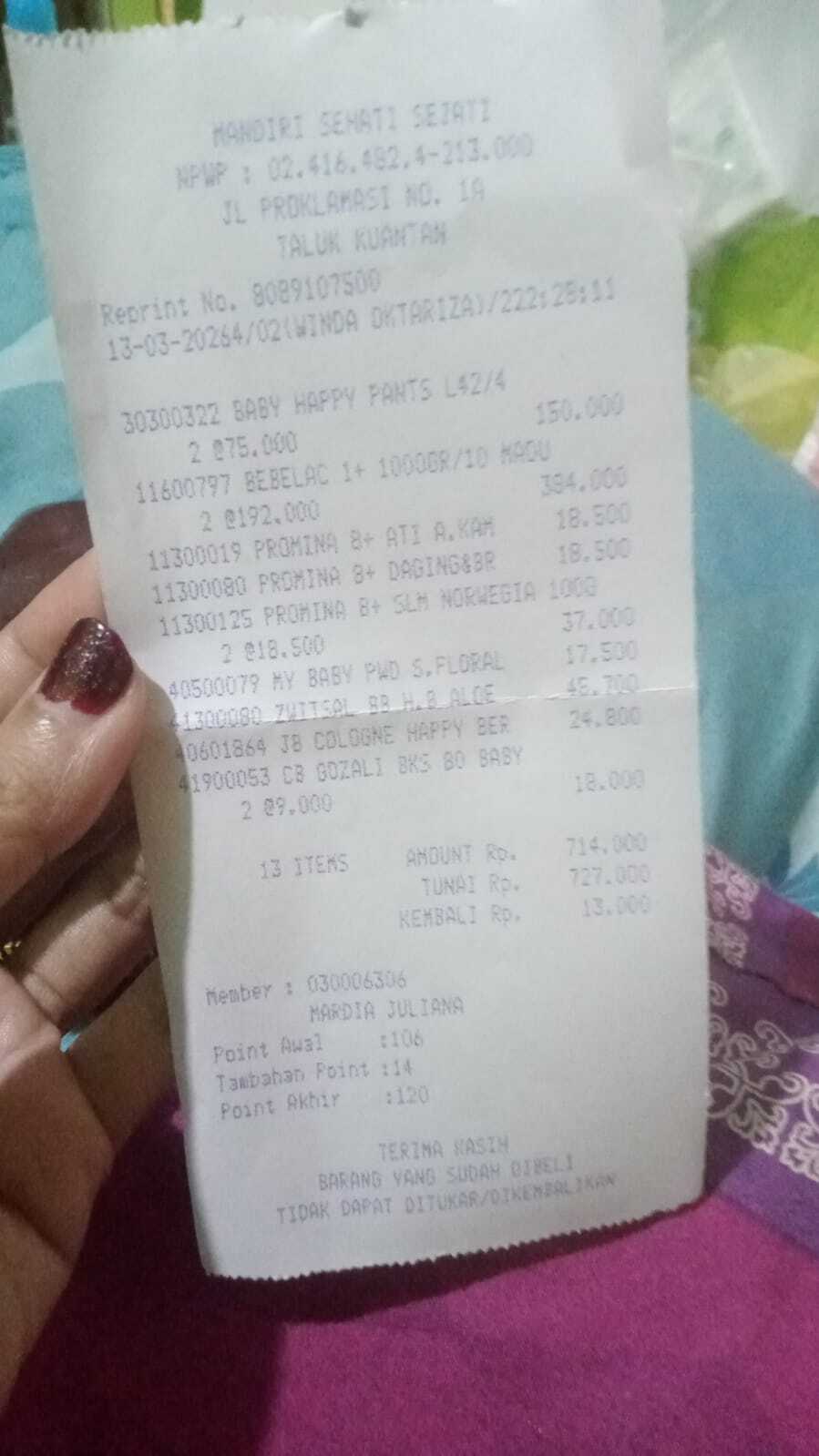 Dana digunakan untuk 1. Susu bebelac Rp.468.900 2. Pempers mamy poko Rp.97.000×2 ball =Rp.194.000 3. Tissue kering Rp.50.000 4. Tissue basah Rp.30.000 5. Baby piper Rp.12.000x 10bungkus= Rp.120.000 6. Sun 10 kotak x Rp.10.000= Rp100.000 7. inavitamin Rp.280.0002026-03-02 08:31:12