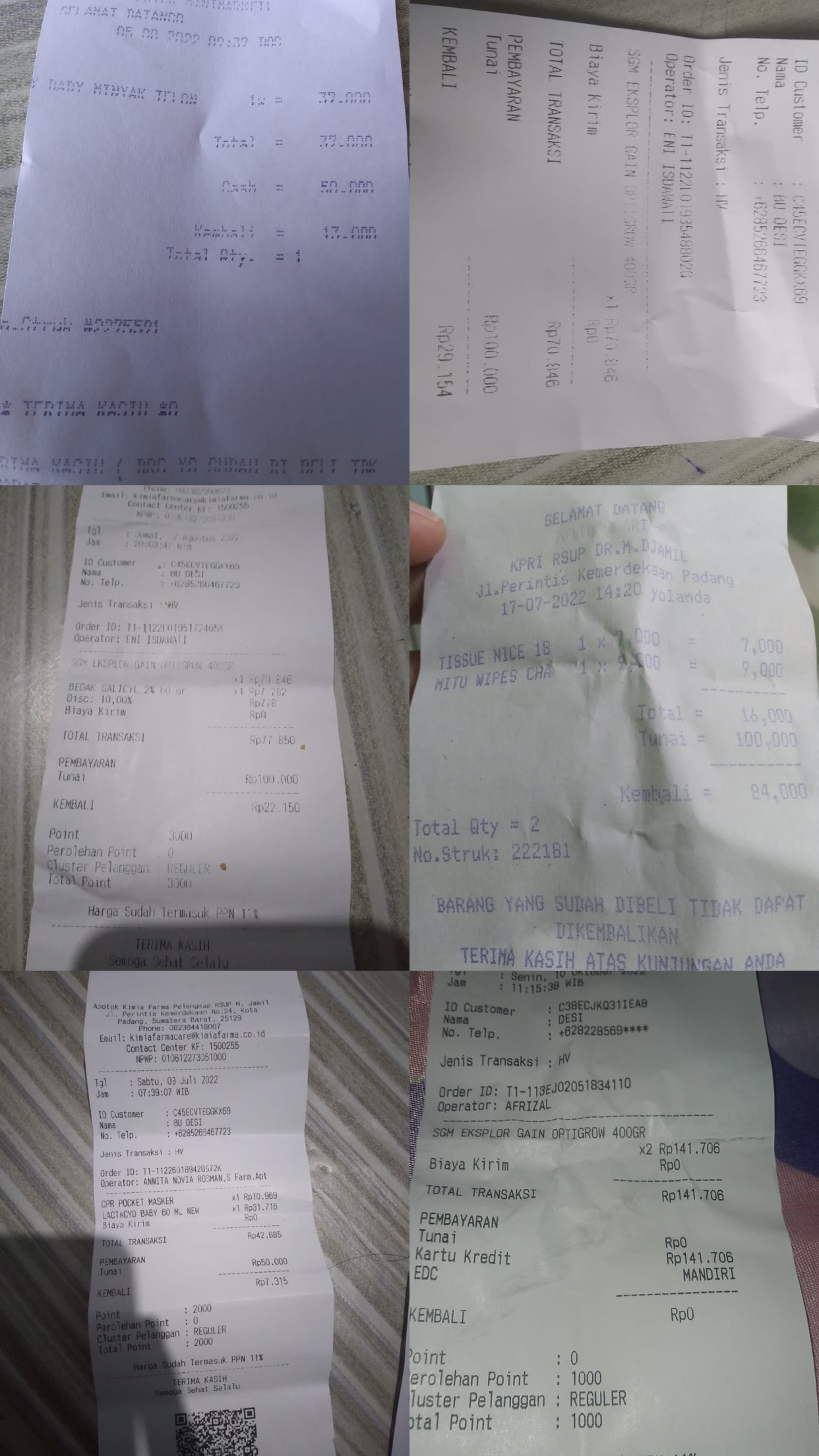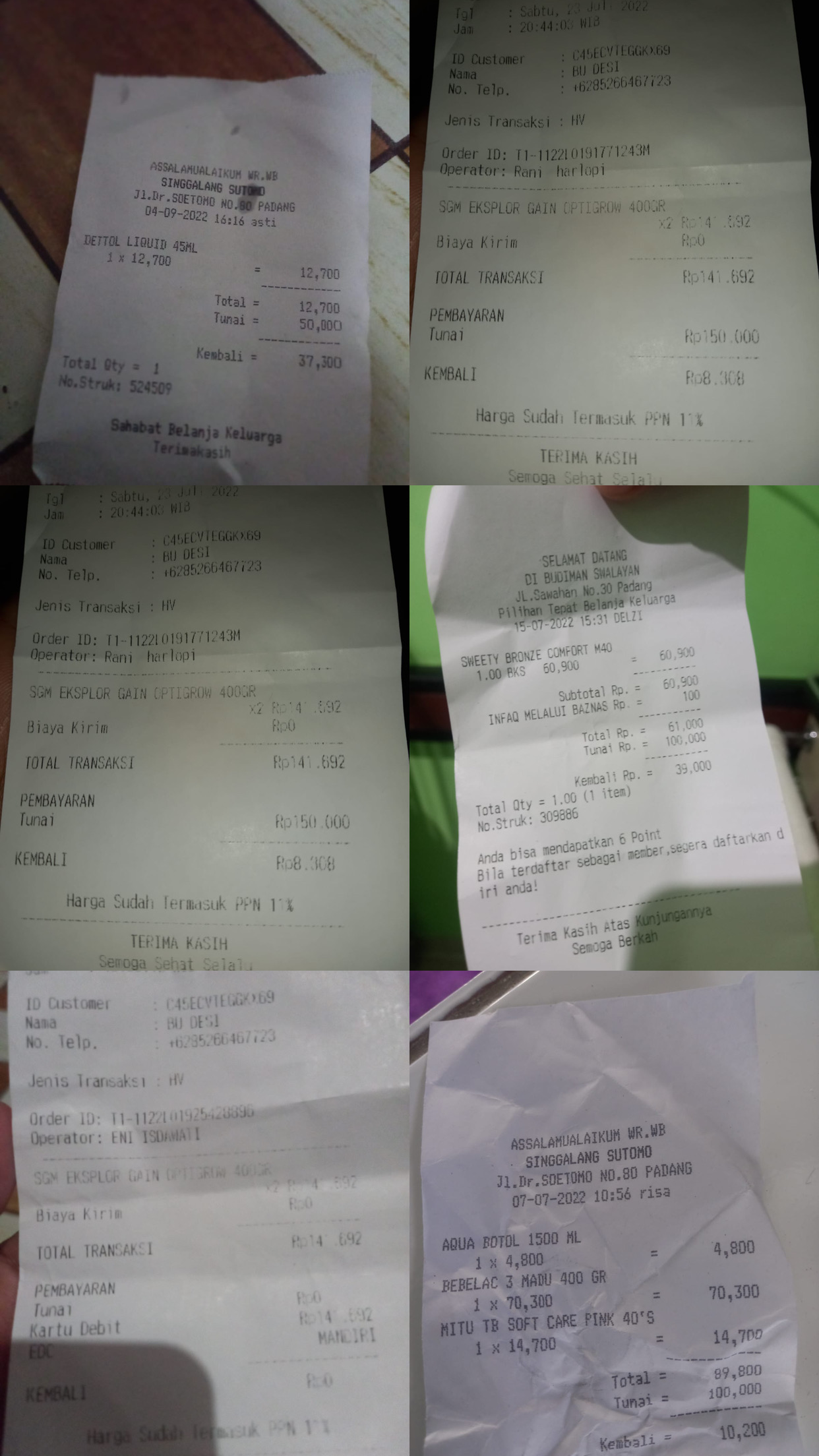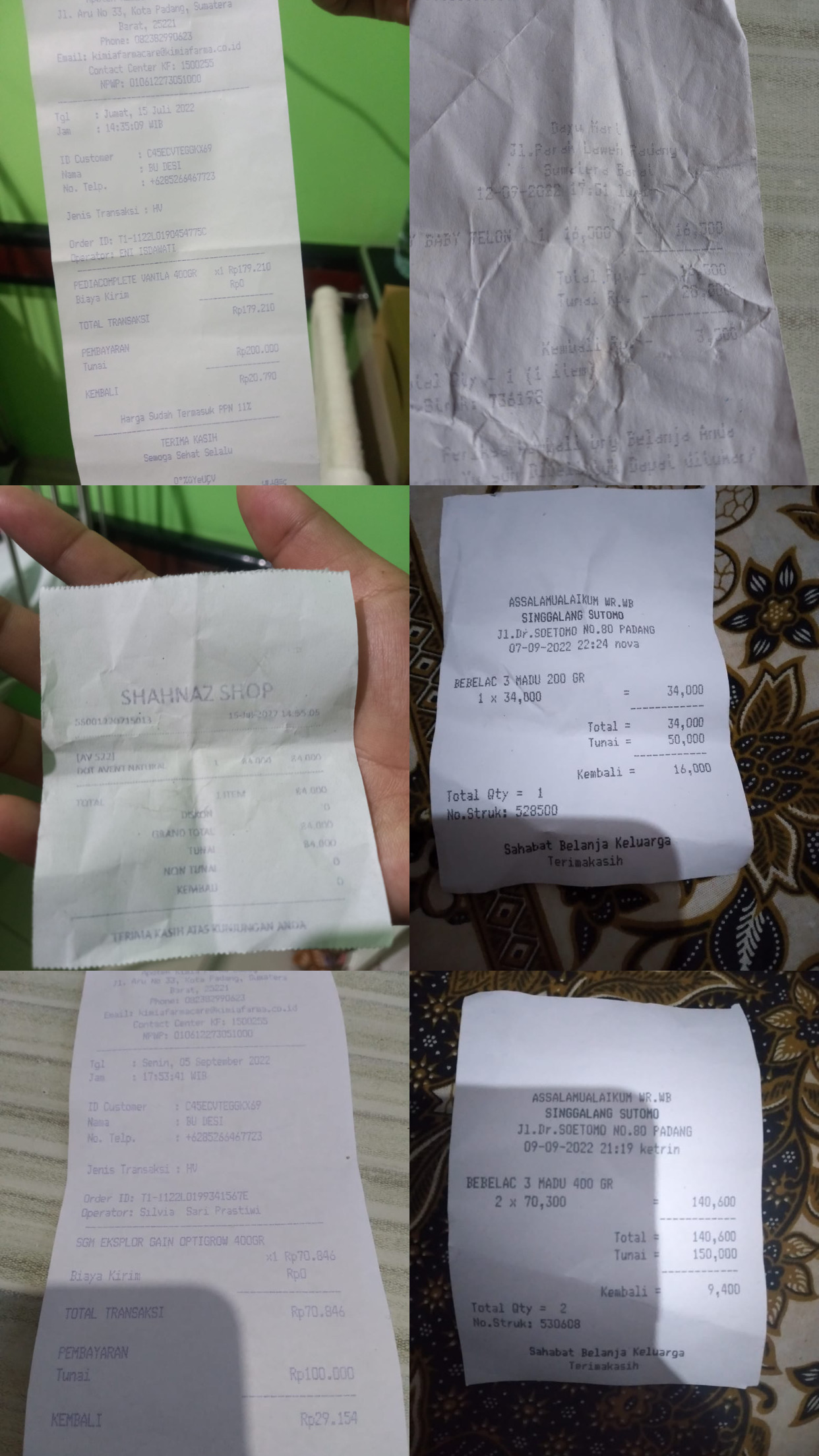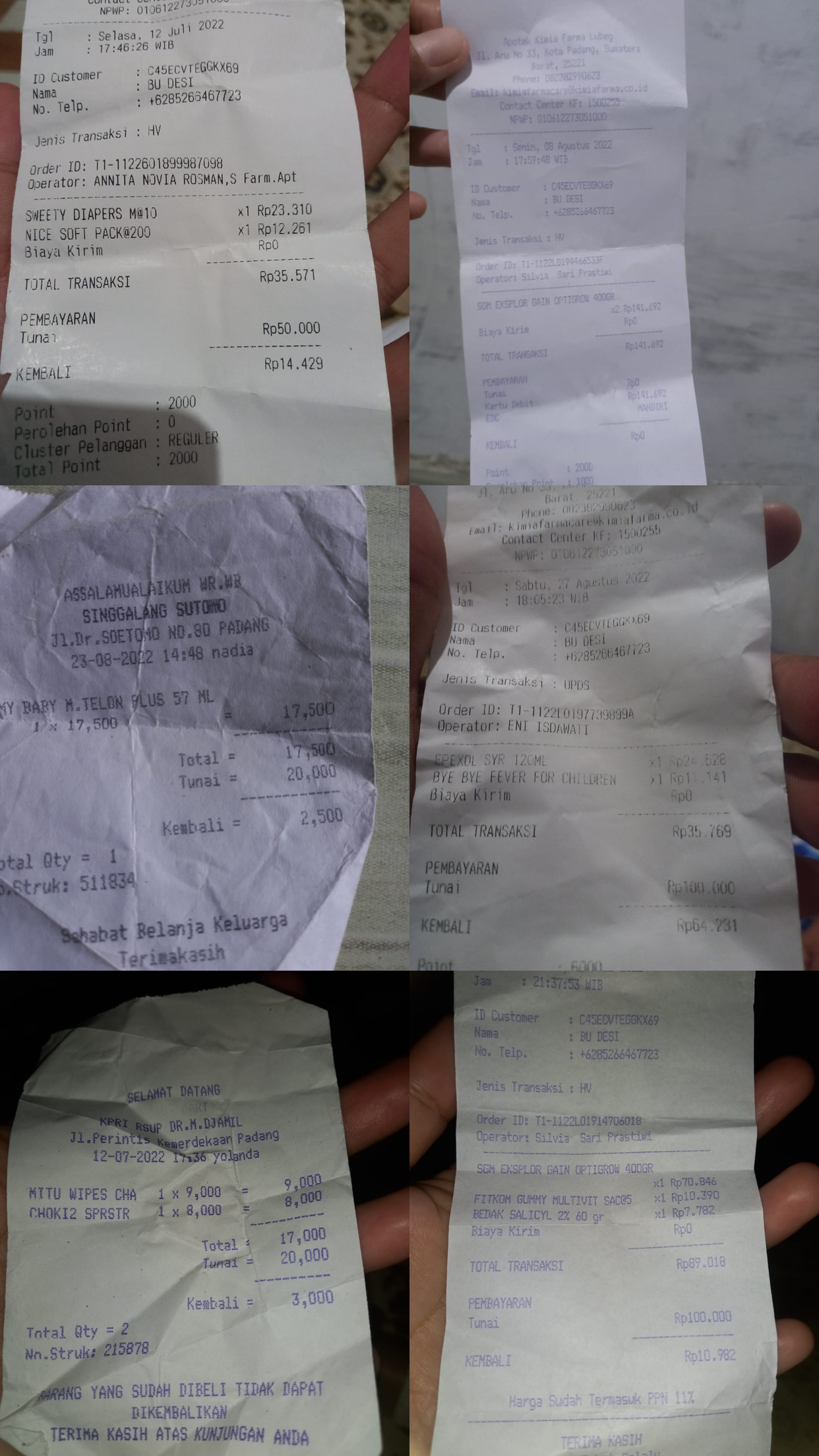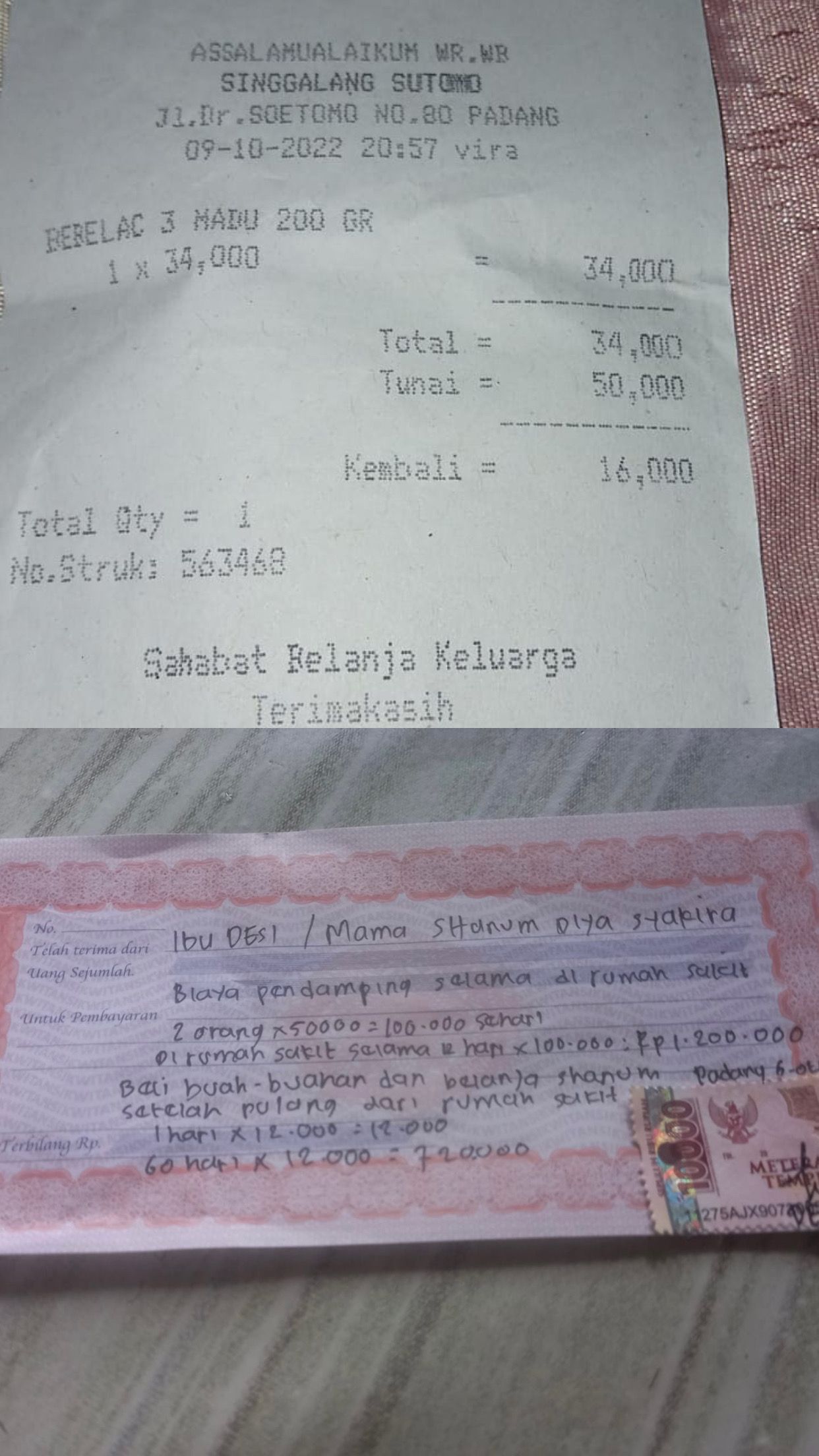 Biaya transportasi pulang ke Padang 3 orang (3,5 Juta), Biaya PCR (500ribu), Kontrol online (5,4 juta), Beli susu, pempers, itamin (2,3 juta)