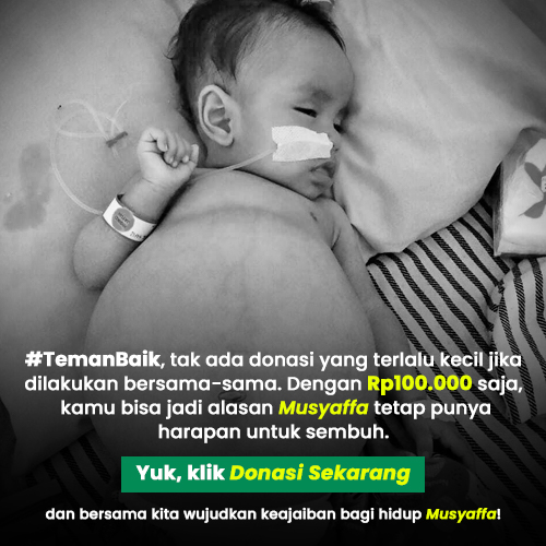 #TemanBaik, tak ada donasi yang terlalu kecil jika dilakukan bersama-sama. Dengan Rp100.000 saja, kita bisa jadi alasan Musyaffa tetap punya harapan untuk sembuh. Yuk, klik Donasi Sekarang dan bersama kita wujudkan keajaiban bagi hidup Musyaffa!