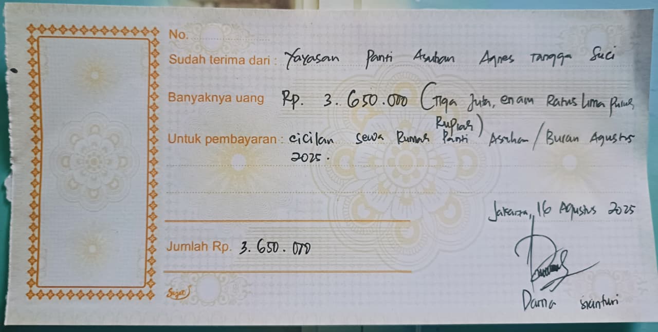 Dana digunakan Untuk Pembayaran cicilan sewa rumah Yayasan panti Asuhan Agnes tangga suci pada Bulan Agustus 20252025-08-18 09:36:09