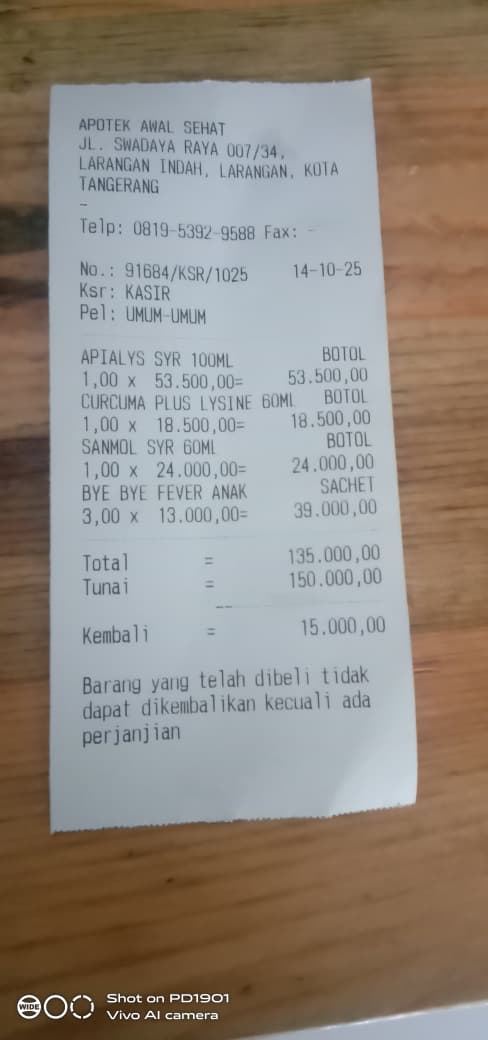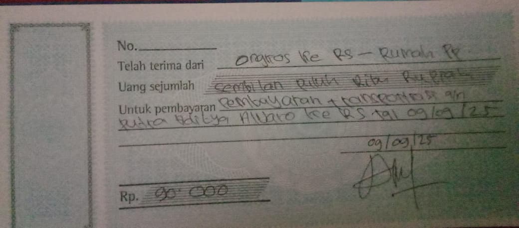 Dana digunakan untuk 1. Susu Vidoran smart 1+ Rp90.000 2. Pampers Rp98 000 3. Transportasi online ke RS Rp90.000 4. Vitamin curcuma Rp20.166 5. Apialys Rp51.122 6. Sanmol Rp24.555 7. Bye bye fifer Rp30.0002025-09-11 09:10:17