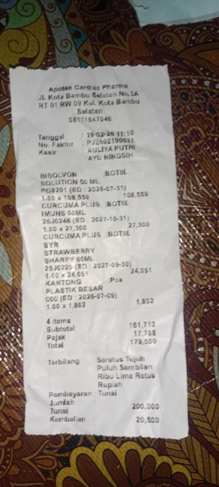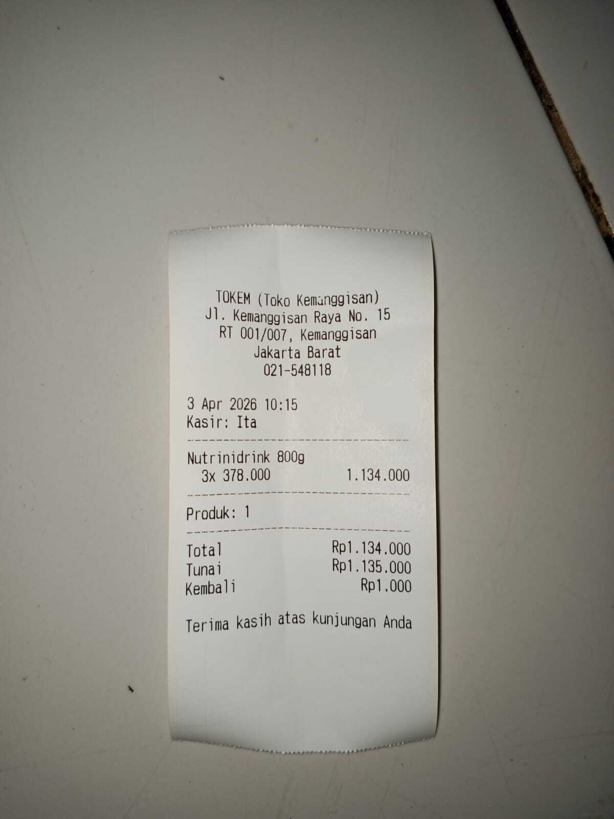 Dana digunakan untuk 1. SusuNutrinidrink 800gram 3klg x Rp378.000= Rp1.131.000 2. Tisu kering 2x Rp20.000= Rp40.000 3. Tisu basah Rp20. 000 4. Vitamin curcuma 2x Rp50.000= Rp100.000 5. Obat hufagrip Rp28.0002026-02-19 11:46:06