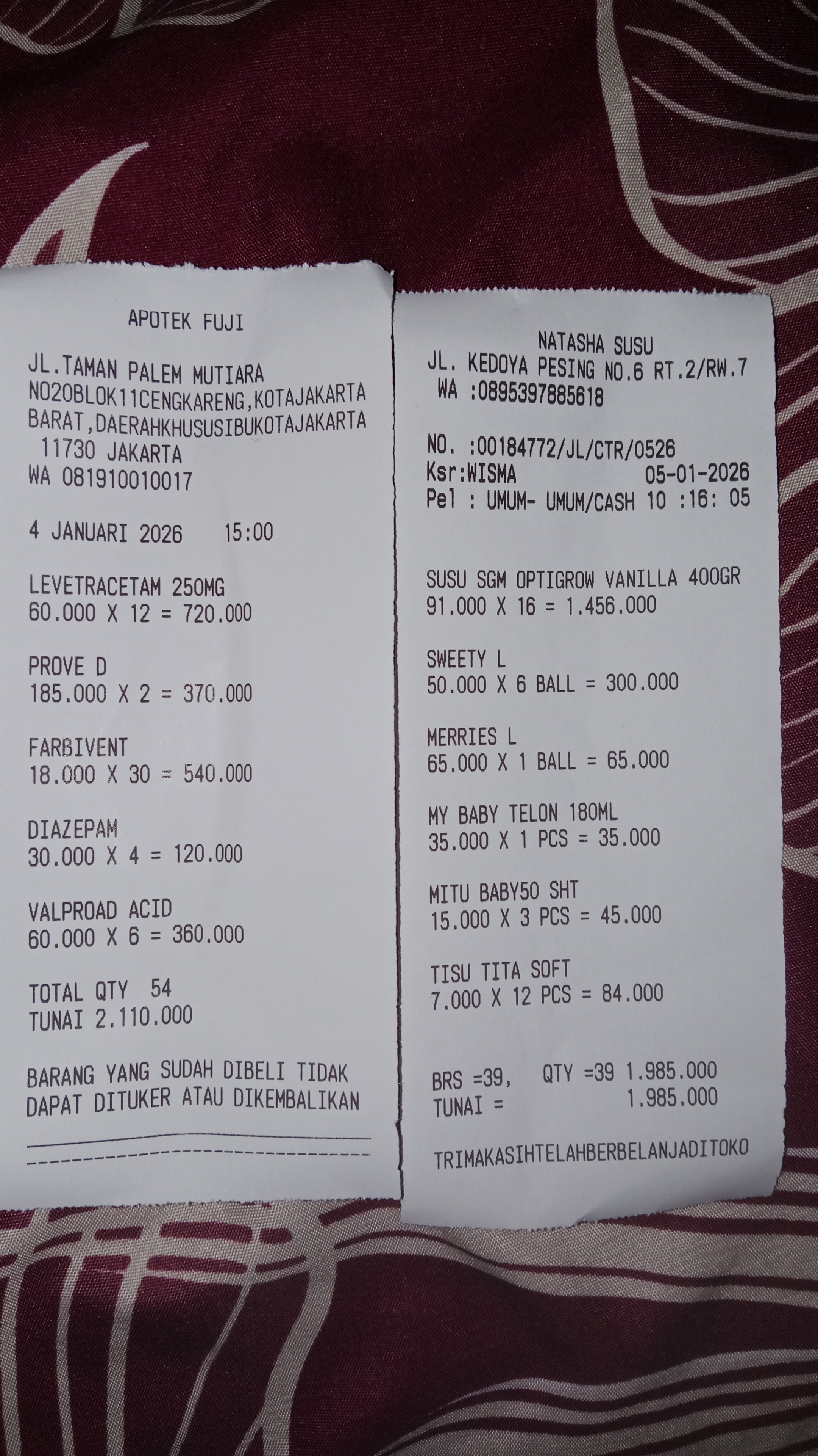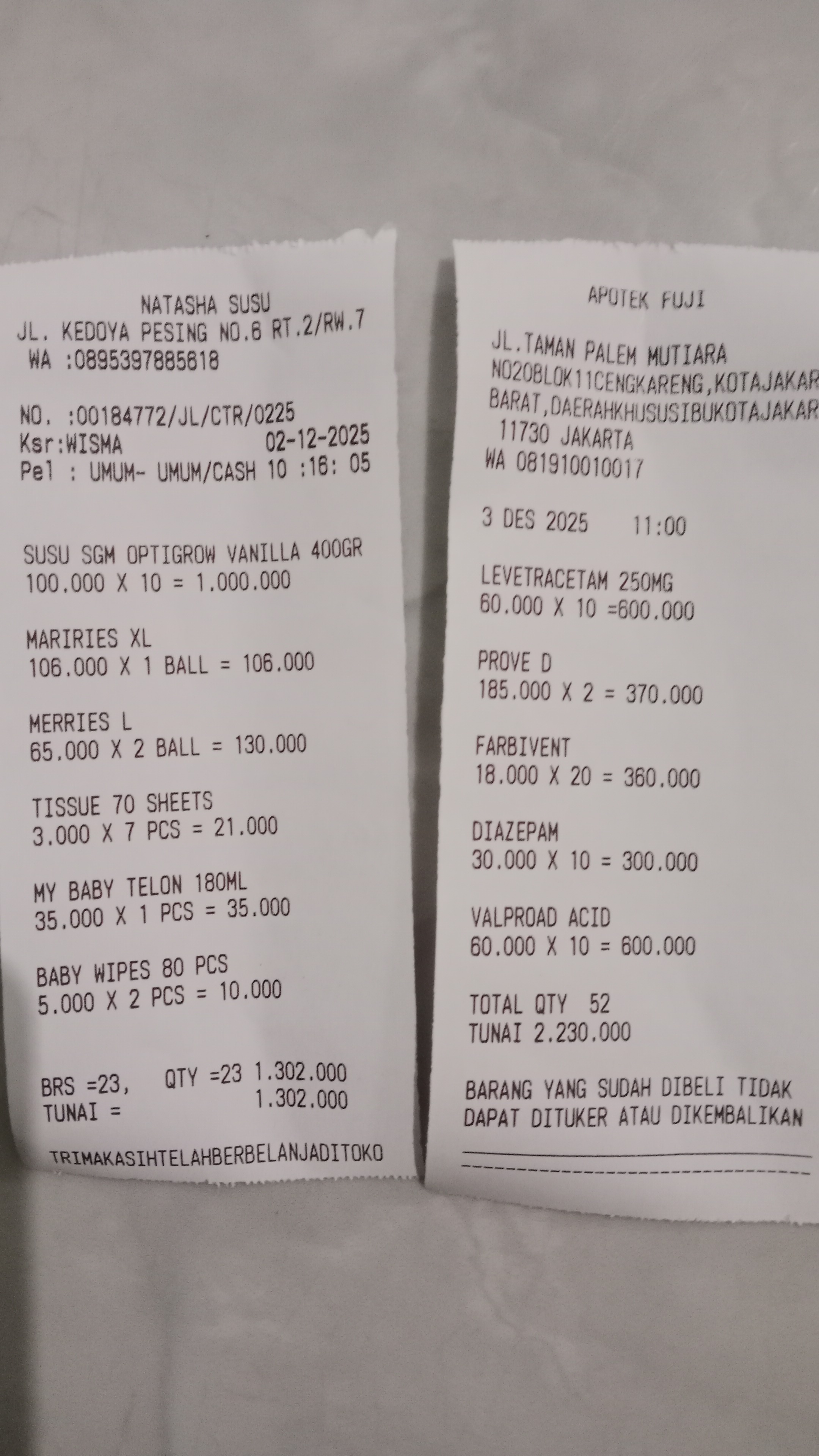 Dana digunakan untuk 1. Reimburse susu optigrw vanilla400gr 10 dus = Rp1.000.000 2. Reimburse pampers Maries XL 3 pcs Rp236.000 3. Reimburse Tisu kering Rp21.000 4. Reimburse My Baby telon 180ml Rp35.000 5. Reimburse Tisu basah Rp10.000 6. Reimburse Obat-obatan non BPJS Rp2.230.0002025-12-05 11:18:12