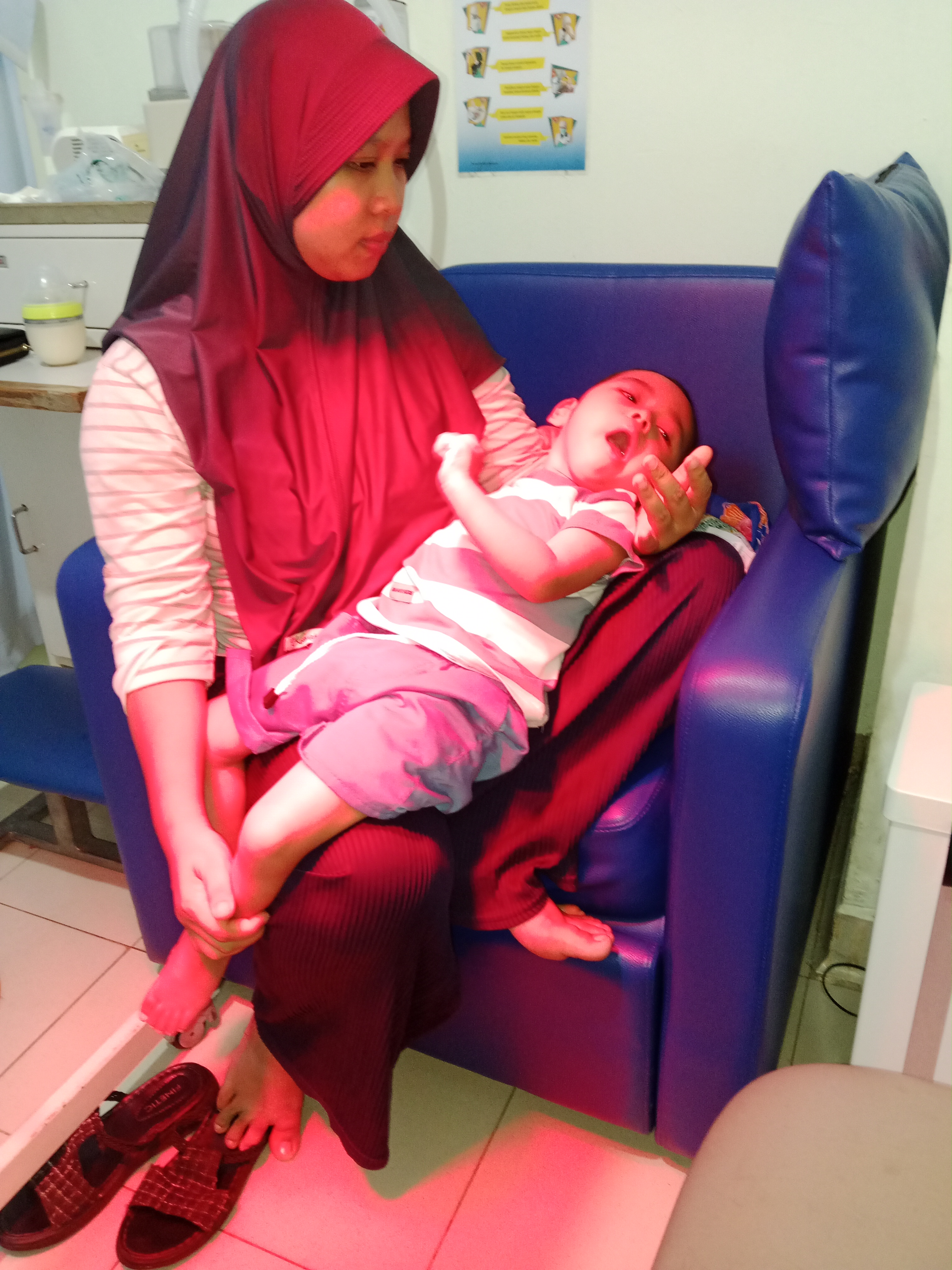 Selain itu, Rayhan juga rutin menjalani fisioterapi tiga kali seminggu karena ia belum bisa tegak, berguling, duduk, maupun berjalan seperti anak-anak lainnya. Saat ini Rayhan masih hanya bisa berbaring, dan kami sebagai orang tua berusaha rutin membawanya menjalani fisioterapi. Semoga terapi ini membawa perkembangan dan Rayhan dapat pulih seperti anak-anak lainnya.