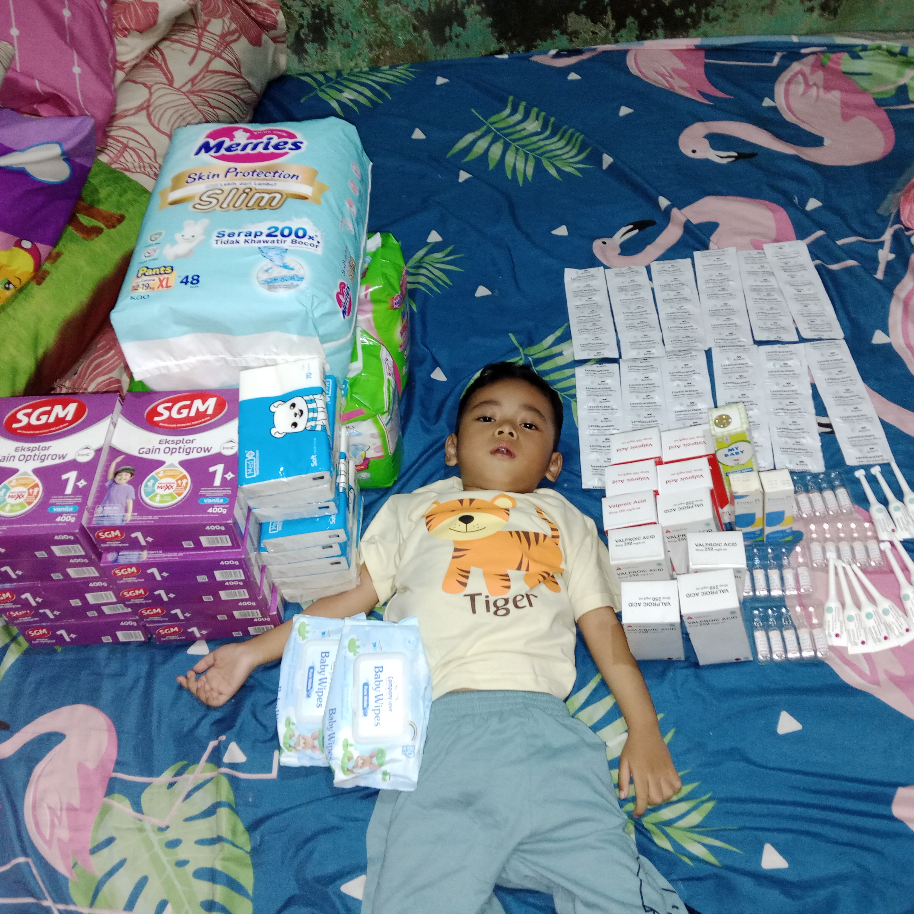 Saat ini kondisi Rayhan cukup baik, namun kejangnya semakin sering. Mohon doanya agar kejang Rayhan dapat berkurang atau hilang. Saat ini Rayhan mengonsumsi empat jenis obat kejang yang harus diminum tepat waktu dan tidak boleh terlambat.