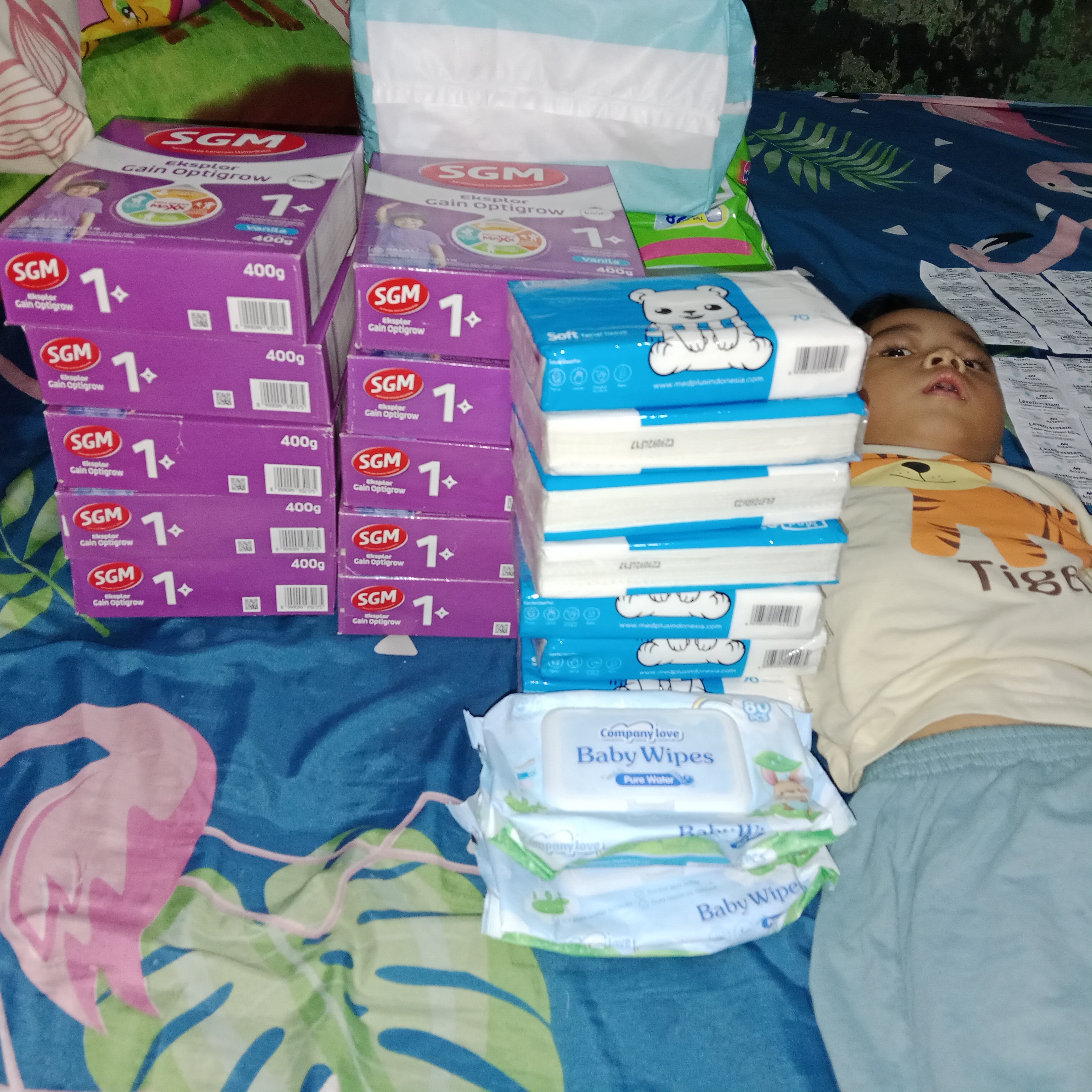 Saya, ibu Rayhan, ingin mengucapkan terima kasih yang sebesar-besarnya kepada #TemanBaik yang telah membantu Rayhan mendapatkan susu khusus, vitamin, dan popok. Alhamdulillah, bantuan ini sangat meringankan kebutuhan kami. Saat ini, kondisi Rayhan masih mengalami kejang berulang, meskipun kami tidak dapat mengunggah videonya. Namun, ada perkembangan dalam berat badannya—dari 8,6 kg kini naik menjadi 9,3 kg. Meski begitu, untuk anak seusianya (2 tahun 3 bulan), berat ini masih kurang dan ia perlu mencapai minimal 12 kg. Karena itu, kami masih sangat membutuhkan susu khusus untuk Rayhan.
