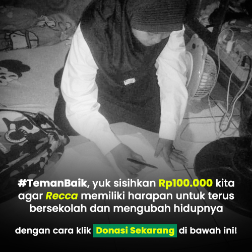 #TemanBaik, yuk sisihkan Rp100.000 kita agar Recca memiliki harapan untuk terus bersekolah dan mengubah hidupnya dengan cara klik Donasi Sekarang di bawah ini!