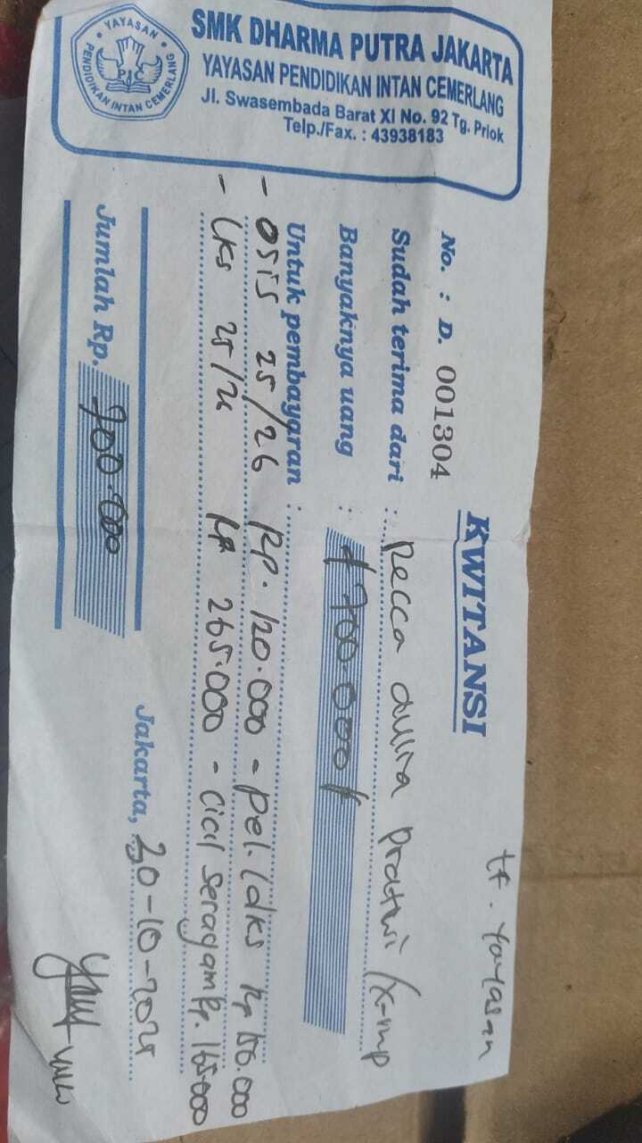 Dana digunakan untuk 1. Tambahan pembayaran spp tertungak Rp250.000 2. Pembayaran LDKS Rp150.000 3. Pembelian topi dasi Rp40.000 4. Kartu pelajar Rp25.0002026-01-09 09:56:51