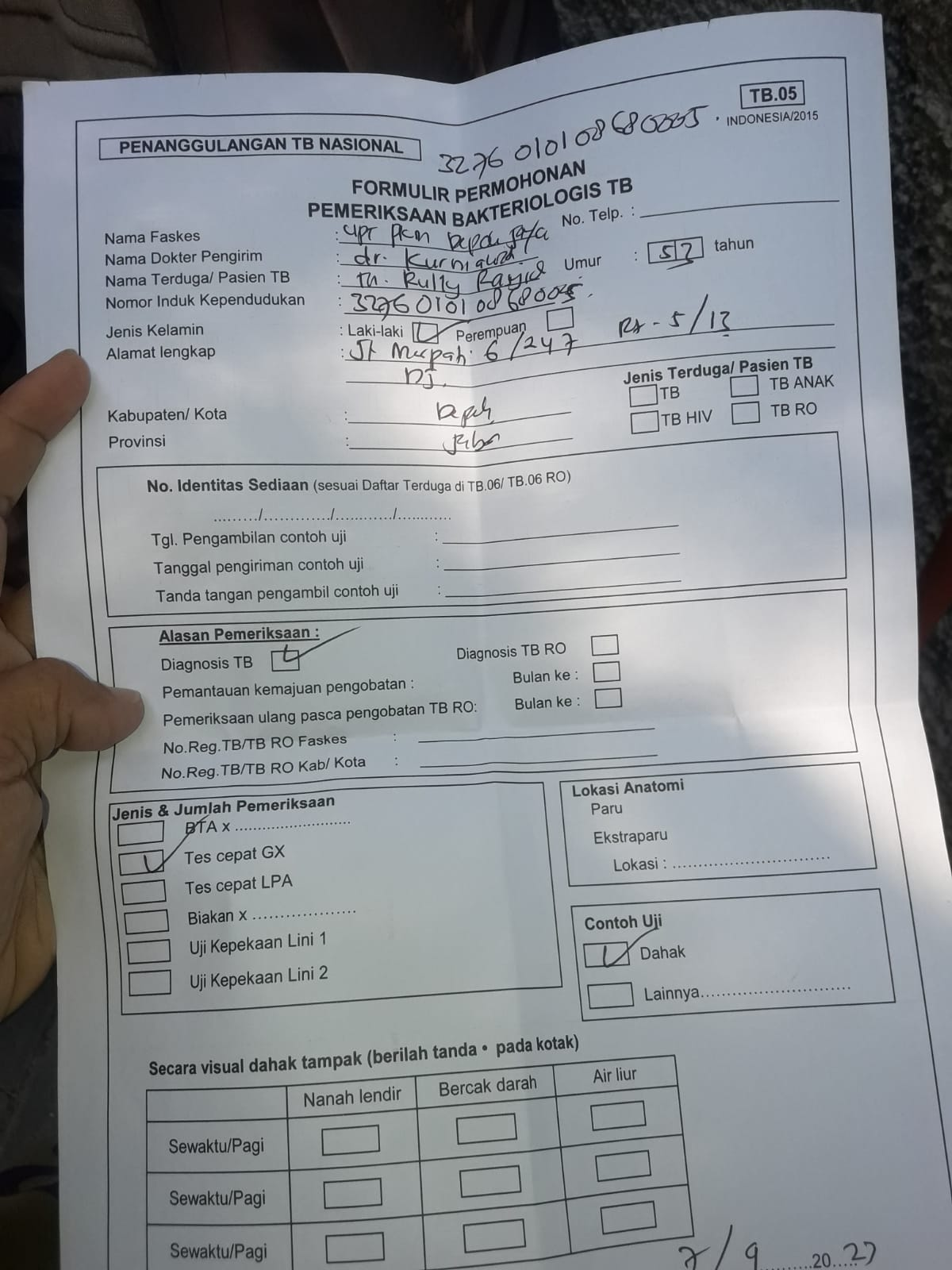 Puskesmas mendiagnosa adikku menderita tuberkulosis (TB). Namun besok hari, adikku perlu kembali lagi dengan membawa dahak dan rujukan ke dokter jantung, karena ia sedang batuk, dan mengalami masalah sesak dari parunya.
