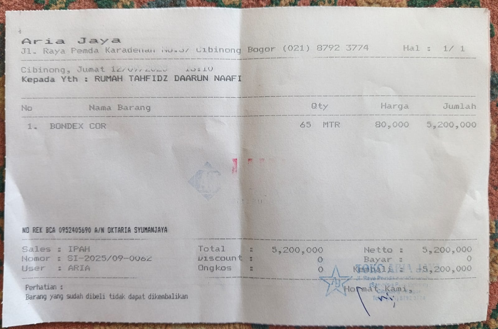 Alhamdulillah, hasil penggalangan dana telah kami konversikan untuk pembelian bondex cor sebanyak 65 meter, dengan rincian sebagai berikut: