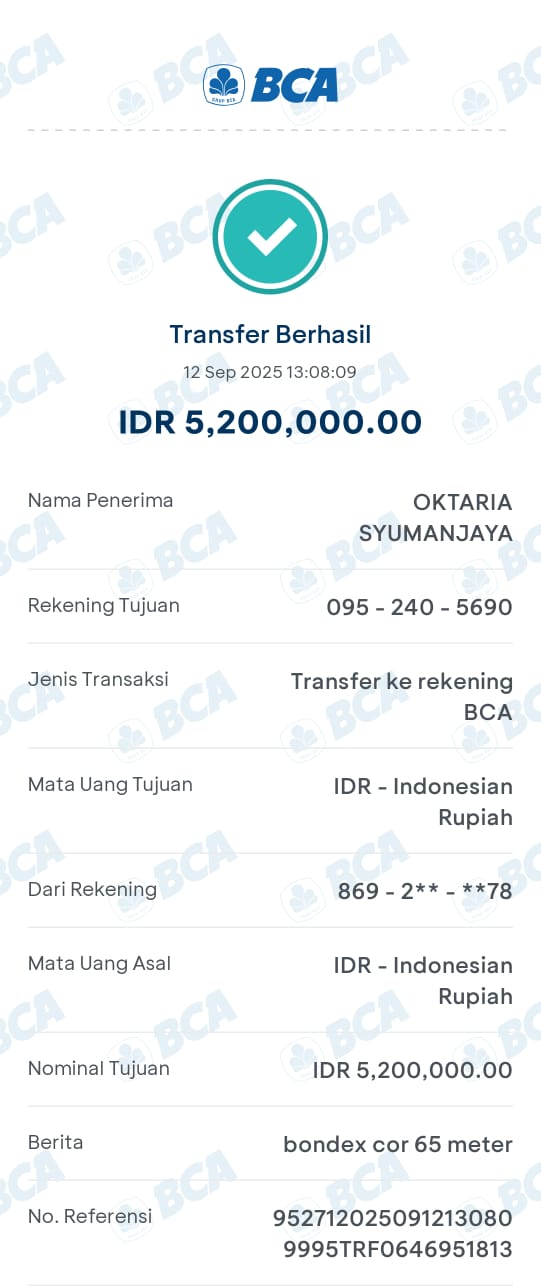 Dana digunakan untuk bondex cor 65 meter Rp80.000 X 65 = Rp5.200.0002025-09-09 09:09:30