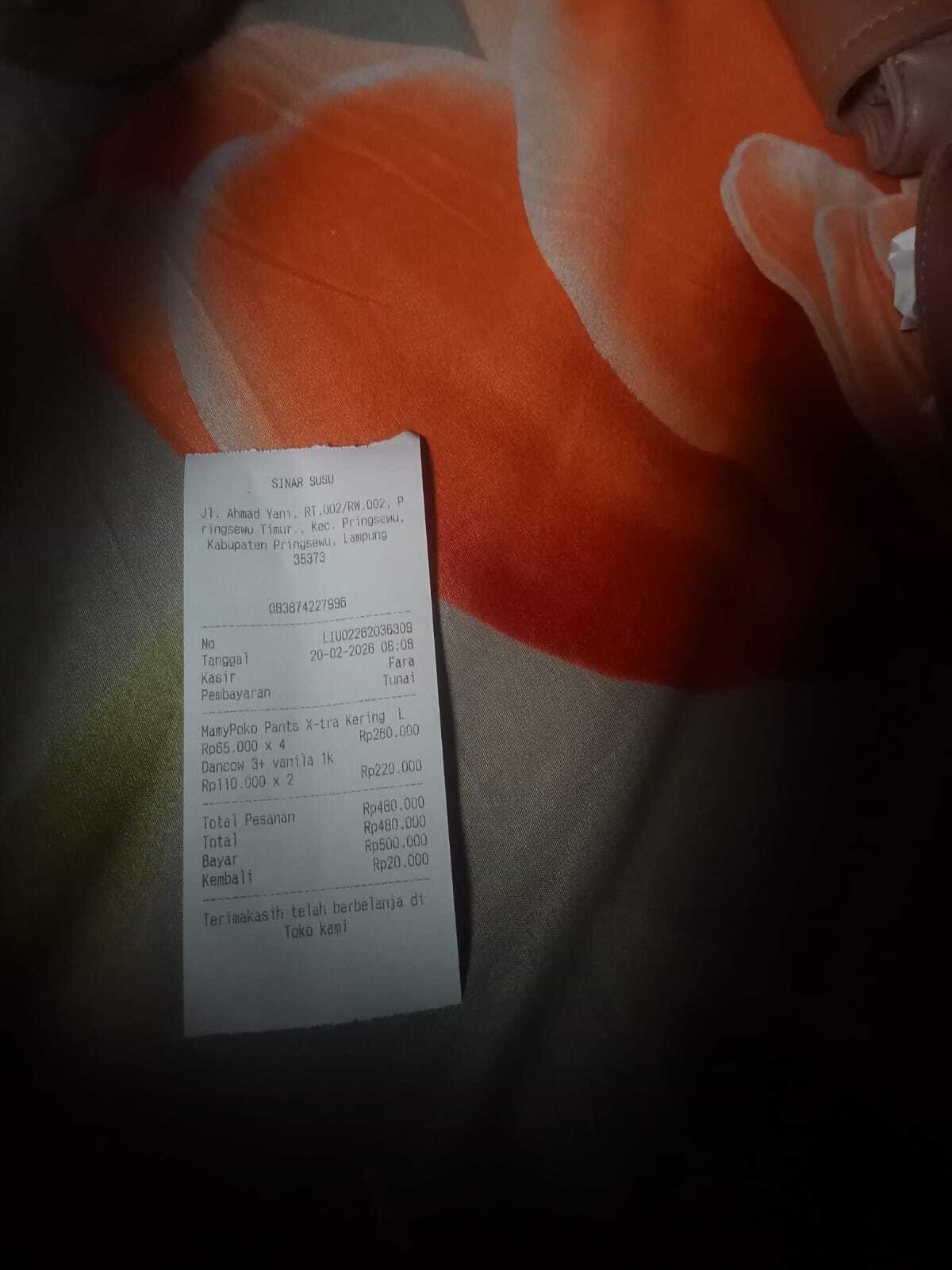 Dana digunakan untuk 1. Susu dancow Rp110 000 x 7 = Rp770.000 2. Pempers Rp65.000 x 4 = Rp260.000 3. Madu vitabumin Rp65.0002026-02-19 11:46:16