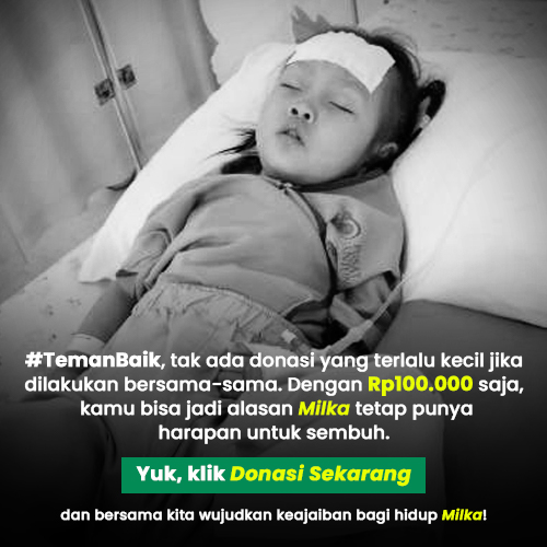 #TemanBaik, tak ada donasi yang terlalu kecil jika dilakukan bersama-sama. Dengan Rp100.000 saja, kita bisa jadi alasan Milka tetap punya harapan untuk sembuh. Yuk, klik Donasi Sekarang dan bersama kita wujudkan keajaiban bagi hidup Milka!