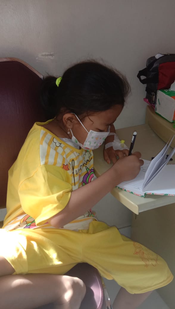 (Hanifah belajar di sela-sela waktu rawat inapnya)