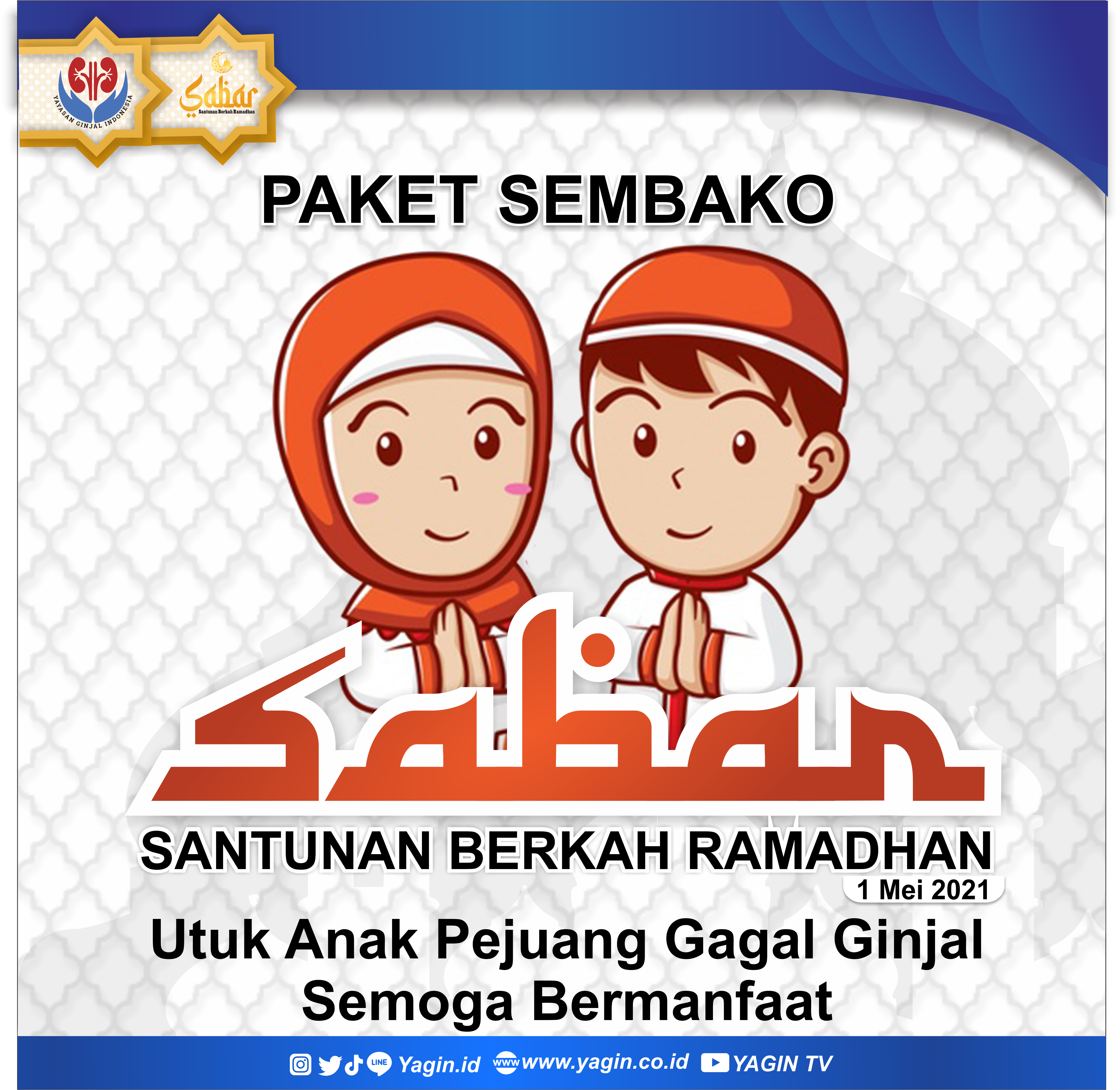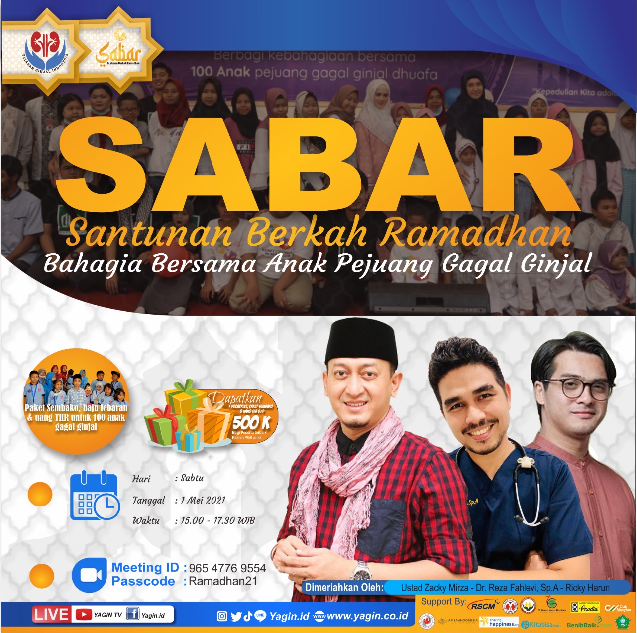 Yayasan Ginjal Indonesia akan mengadakan acara SABAR (Santunan Berkah Ramadhan) pada tanggal 1 Mei 2021 pada acara tersebut kami akan mengadakan ceromonial via zoom meeting, mendengarkan ceramah dari Ustad Zacky Mirza, mendengarkan pembacaan Ayat Suci Al-Qur'an oleh anak pejuang gagal ginjal serta dihibur oleh anak pejuang gagal ginjal dan dokter Refa (spesialis anak) serta acara ini akan dipandu oleh kak Ricky Harun, pasti bakal seru banget ya.