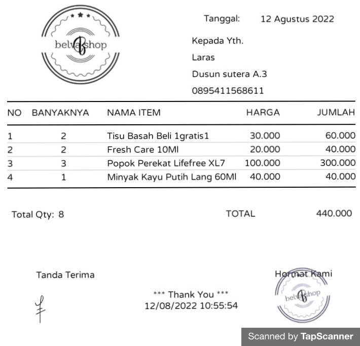 Laras sedang mengalami diare dan dana ini digunakan untuk membeli ●Pampers lifefree perekat 1Bal (isi7pcs uk:XL)@100.000×3bal = 300.000 ●Tisu Mitu Baby 30.000×2 = 60.000 ●Freshcare 20.000×2= 40.000 ●Minyak Kayu Putih = 36.500