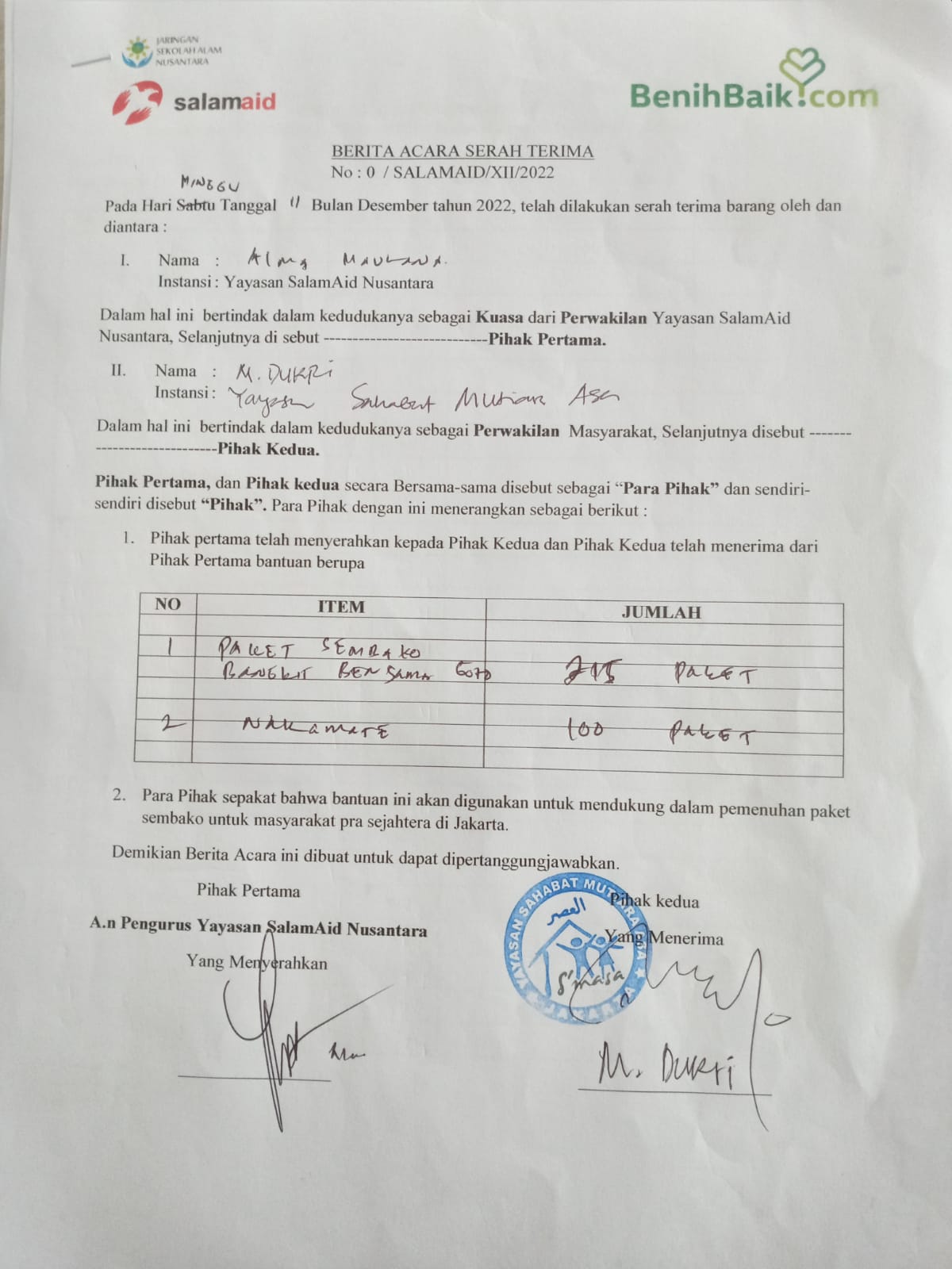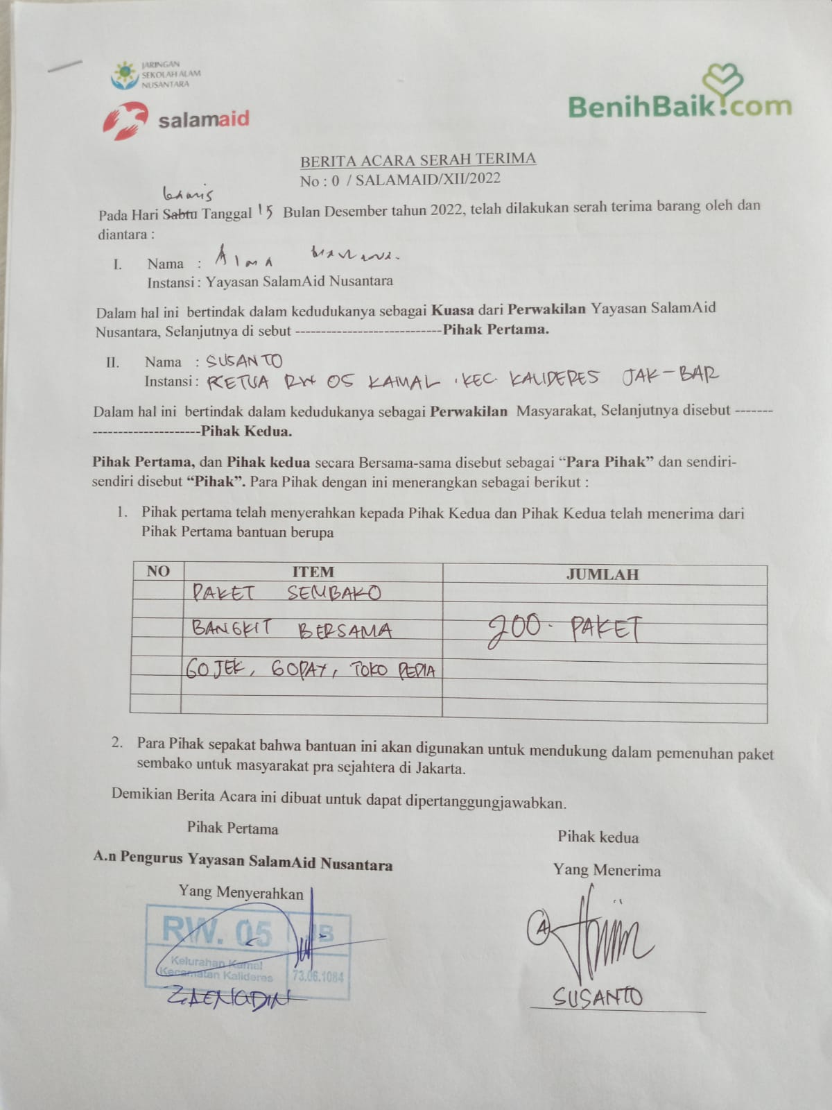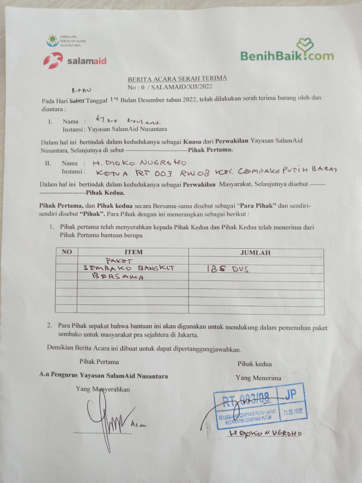 dana digunakan untuk pengadaan 1.450 paket sembako wilayah Bekasi dan 1.250 paket sembako wilayah Depok via merchant Freshbox, pembayaran melalui BCA virtual account BenihBaik di aplikasi Tokopedia2022-02-05 12:12:22
