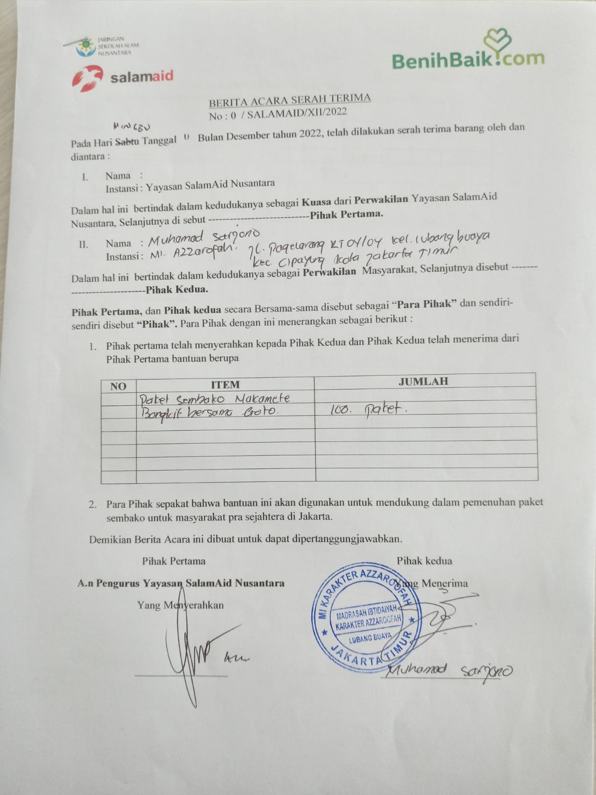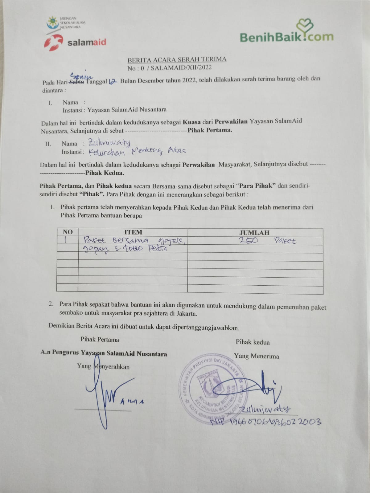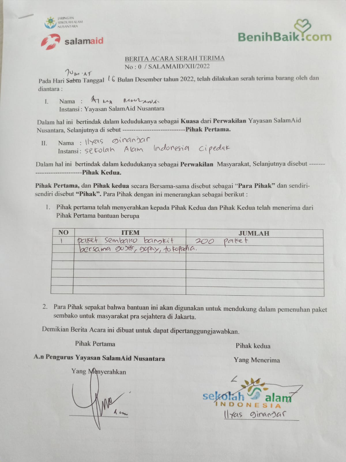 dana digunakan untuk pengadaan 1.450 paket sembako wilayah Bekasi dan 1.250 paket sembako wilayah Depok via merchant Freshbox, pembayaran melalui BCA virtual account BenihBaik di aplikasi Tokopedia2022-02-05 12:12:22