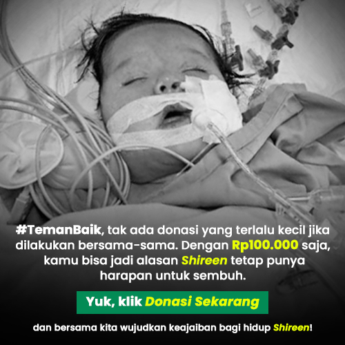 #TemanBaik, tak ada donasi yang terlalu kecil jika dilakukan bersama-sama. Dengan Rp100.000 saja, kita bisa jadi alasan Shireen tetap punya harapan untuk sembuh. Yuk, klik Donasi Sekarang dan bersama kita wujudkan keajaiban bagi hidup Shireen!