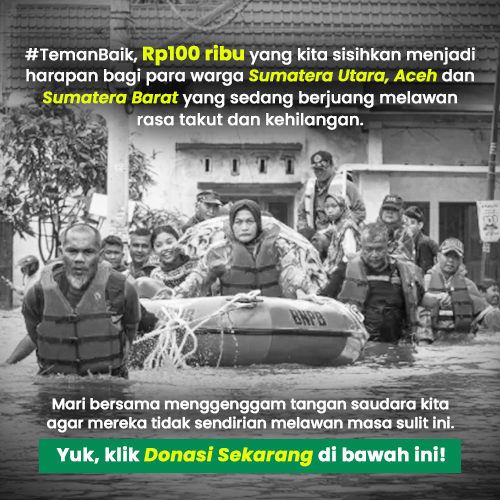#TemanBaik, Rp100 ribu yang kita sisihkan menjadi harapan bagi para warga Sumatera Utara, Aceh dan Sumatera Barat yang sedang berjuang melawan rasa takut dan kehilangan. mari bersama menggenggam tangan saudara kita agar mereka tidak sendirian melawan masa sulit ini. Yuk klik Donasi Sekarang di bawah ini!
