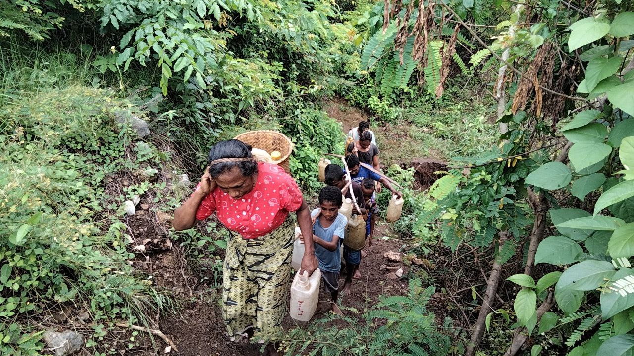 Kami harus menempuh jalan yang tidak mudah, naik turun bukit, dan jalannya licin karena penuh kerikil. Normalnya ditempuh selama 30-40 menit saja, tapi kami bisa sampai 1 jam dengan membawa jerigen air.