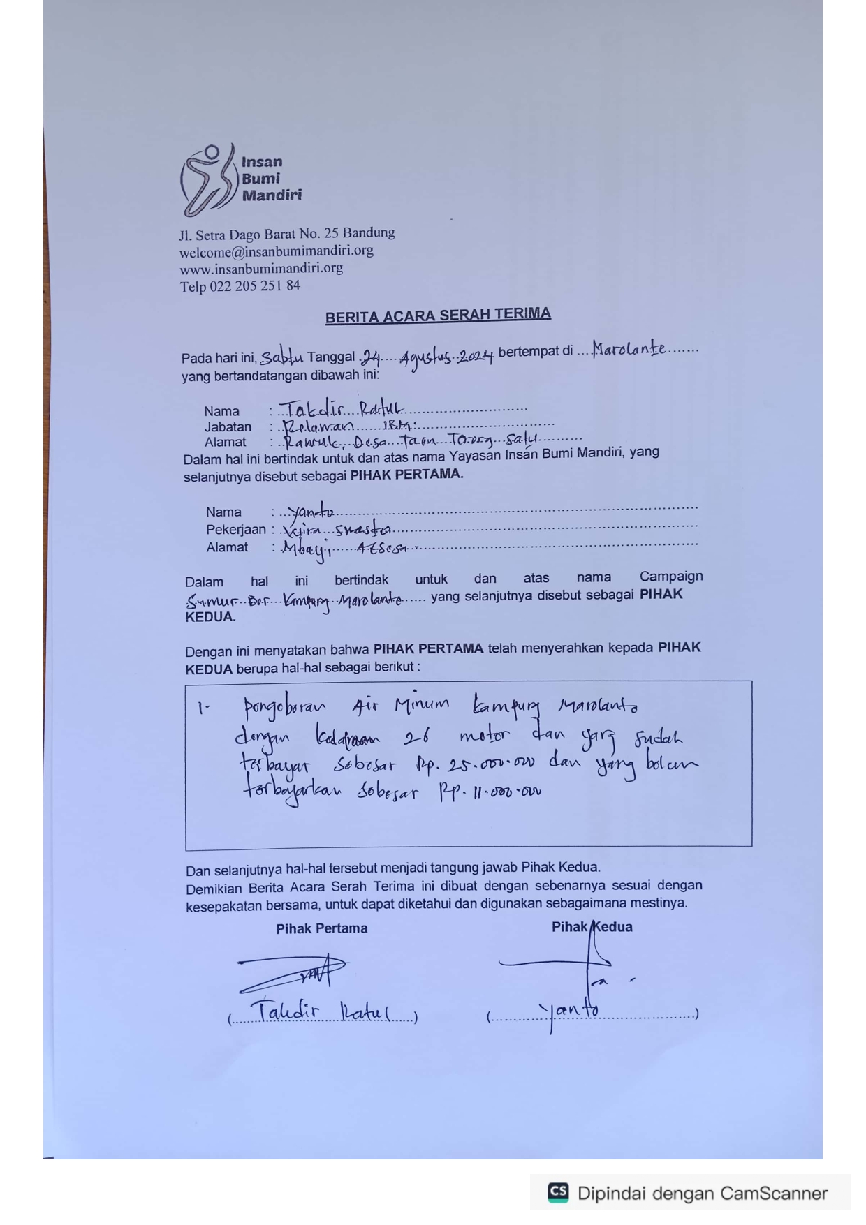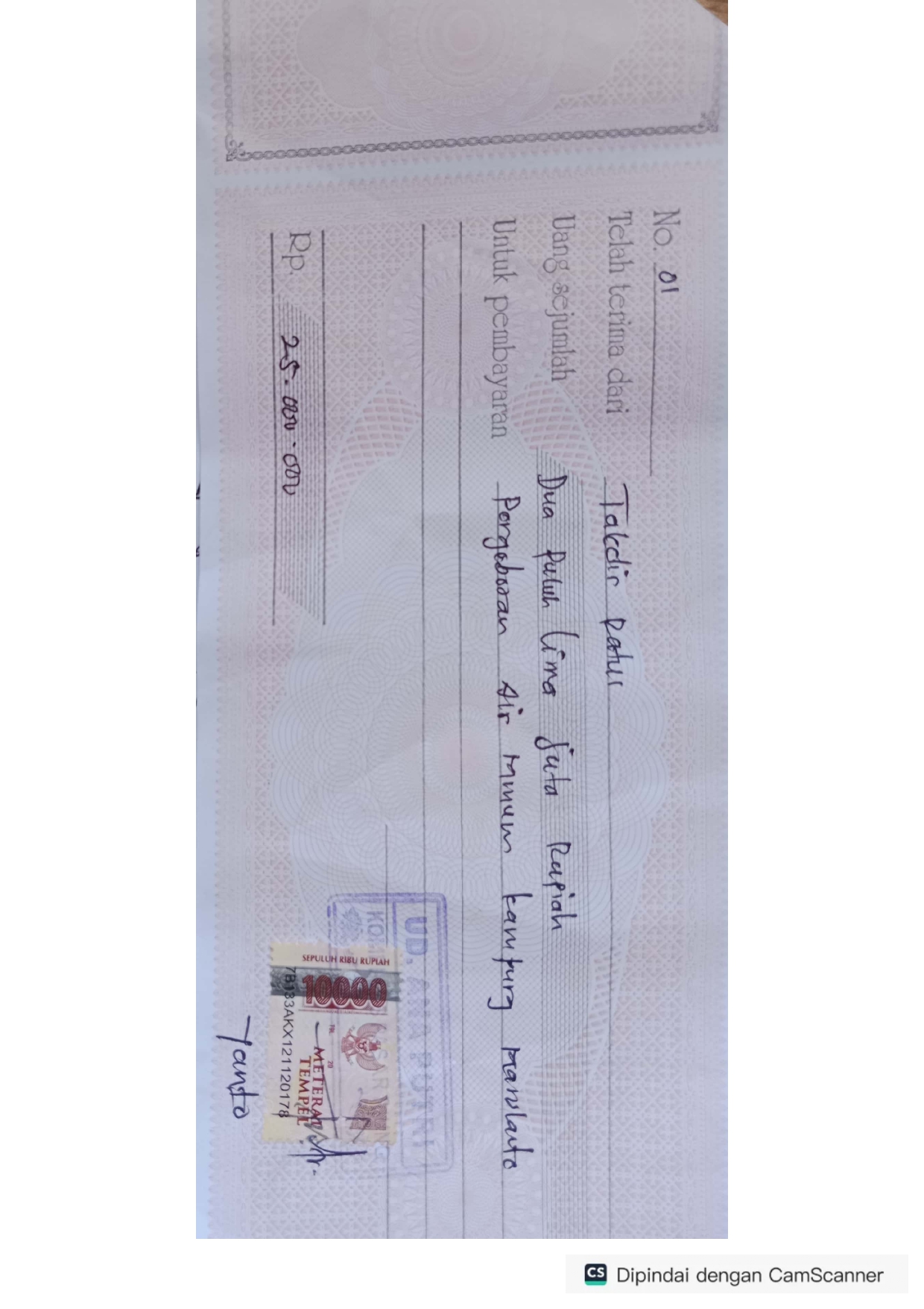 Dana digunakan untuk 1. Tandon 1 buah Rp2.060.000 2. Biaya akomodasi dan ATK relawan lapangan Rp332.960 3. Biaya operasional lembaga pendamping (5%) Rp119.090.2023-09-29 19:25:07
