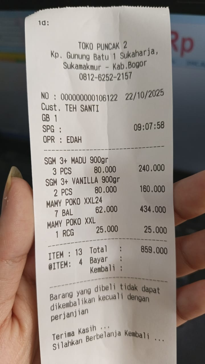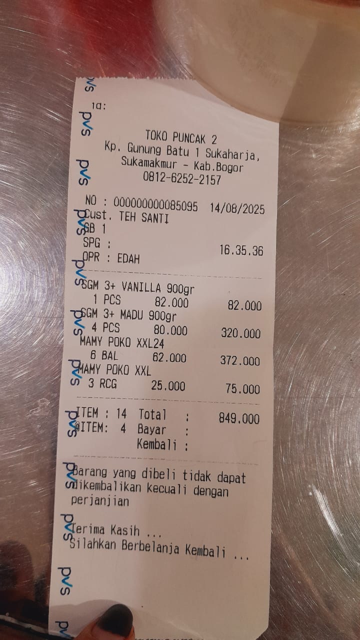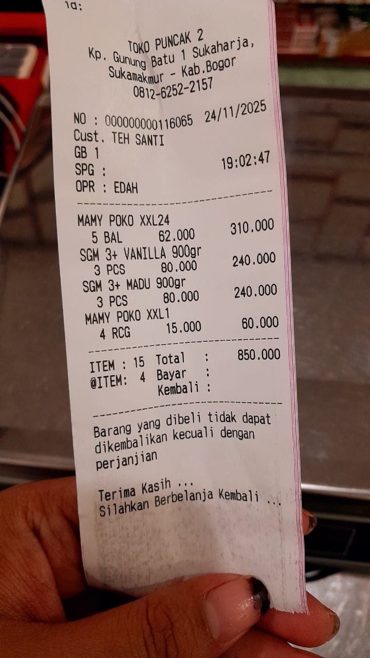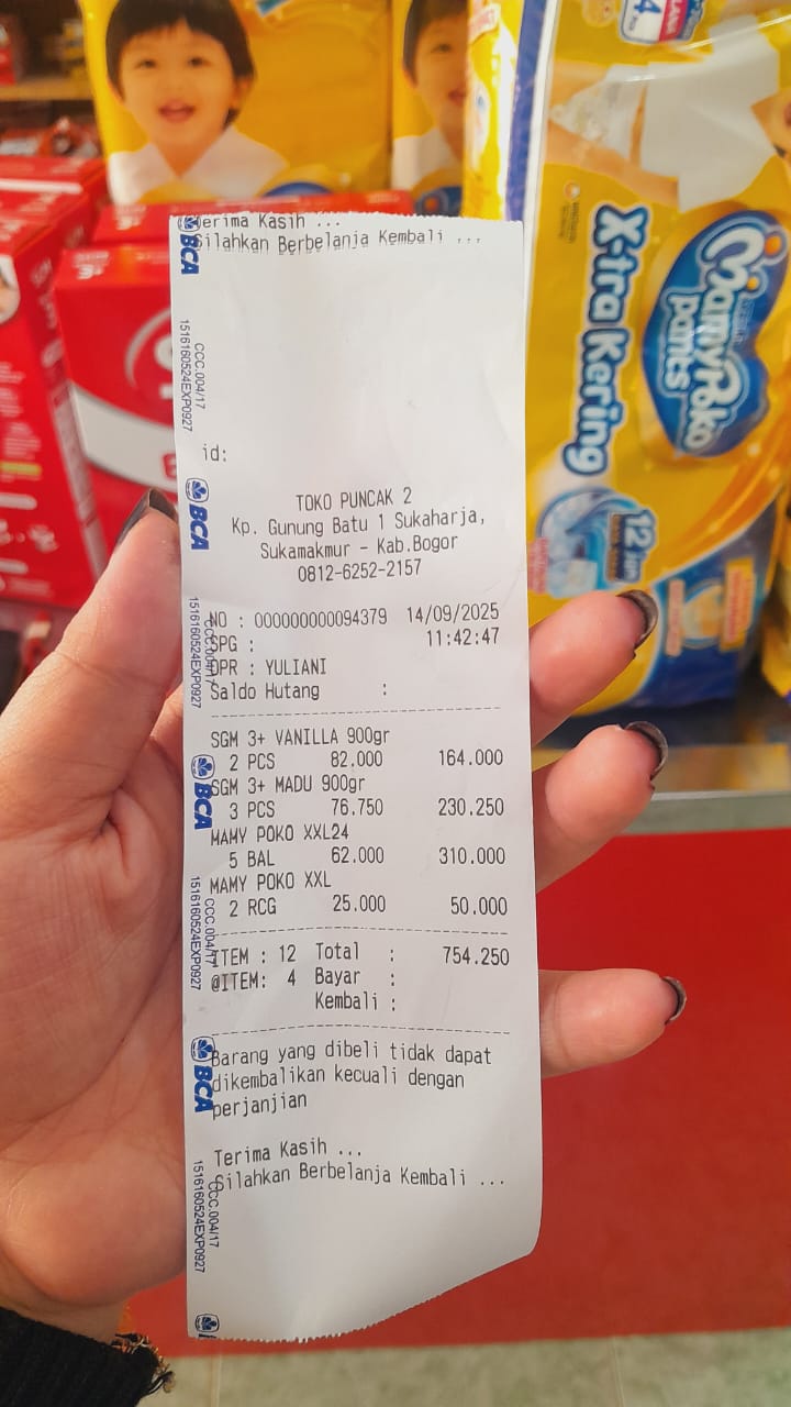 Dana digunakan untuk 1. Susu sgm 3+ Rp80.000 x 5 dus = Rp400.000 2. Pampers mamypoko XXL Rp75.000x5ball = Rp375.000 3. Prove D3 1000 Iu box 30 tablet Rp126.0642025-05-19 14:19:00