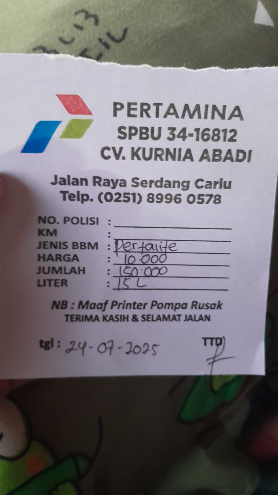 Dana digunakan untuk 1. Pampers mamy poko XXL Rp75.000 X 5 ball = Rp375.000 2. Susu Sgm 3+ Rp80.000 X 5dus = Rp400.000 3. Sewa mobil ke RS hermina grand wisata Rp300.000 4. Pembelian bensin kendaraan PP bogor-cikarang Rp100.000 5. Viitamin D 3 box 30 tablet Rp100.0002025-06-12 09:49:21