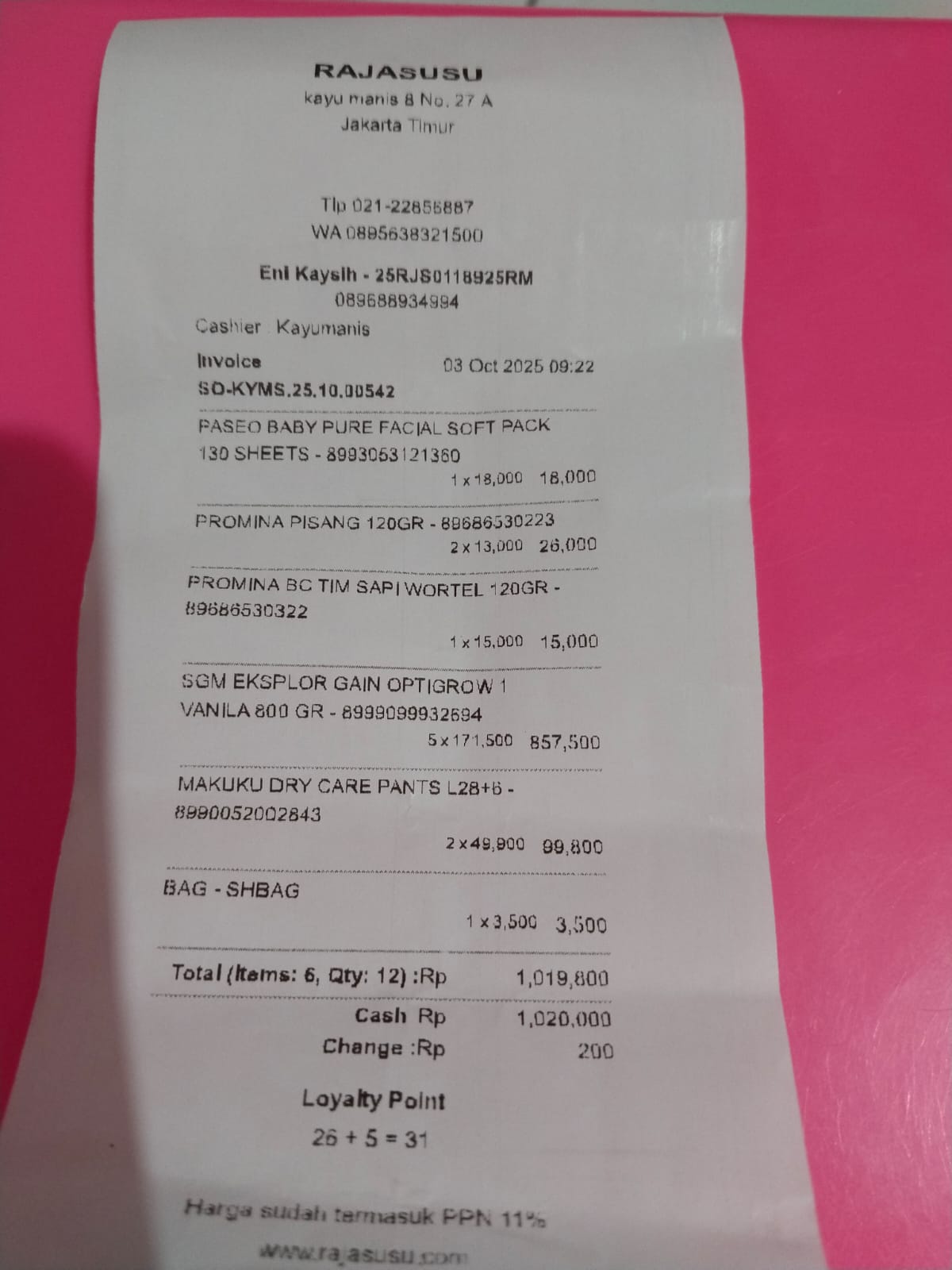 Bubur bayi Promina 2 dus × Rp13.000 = Rp26.000