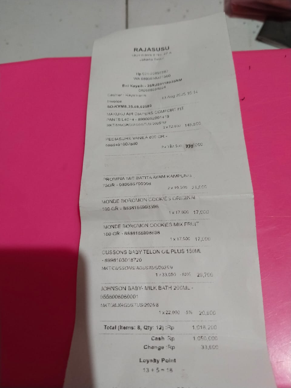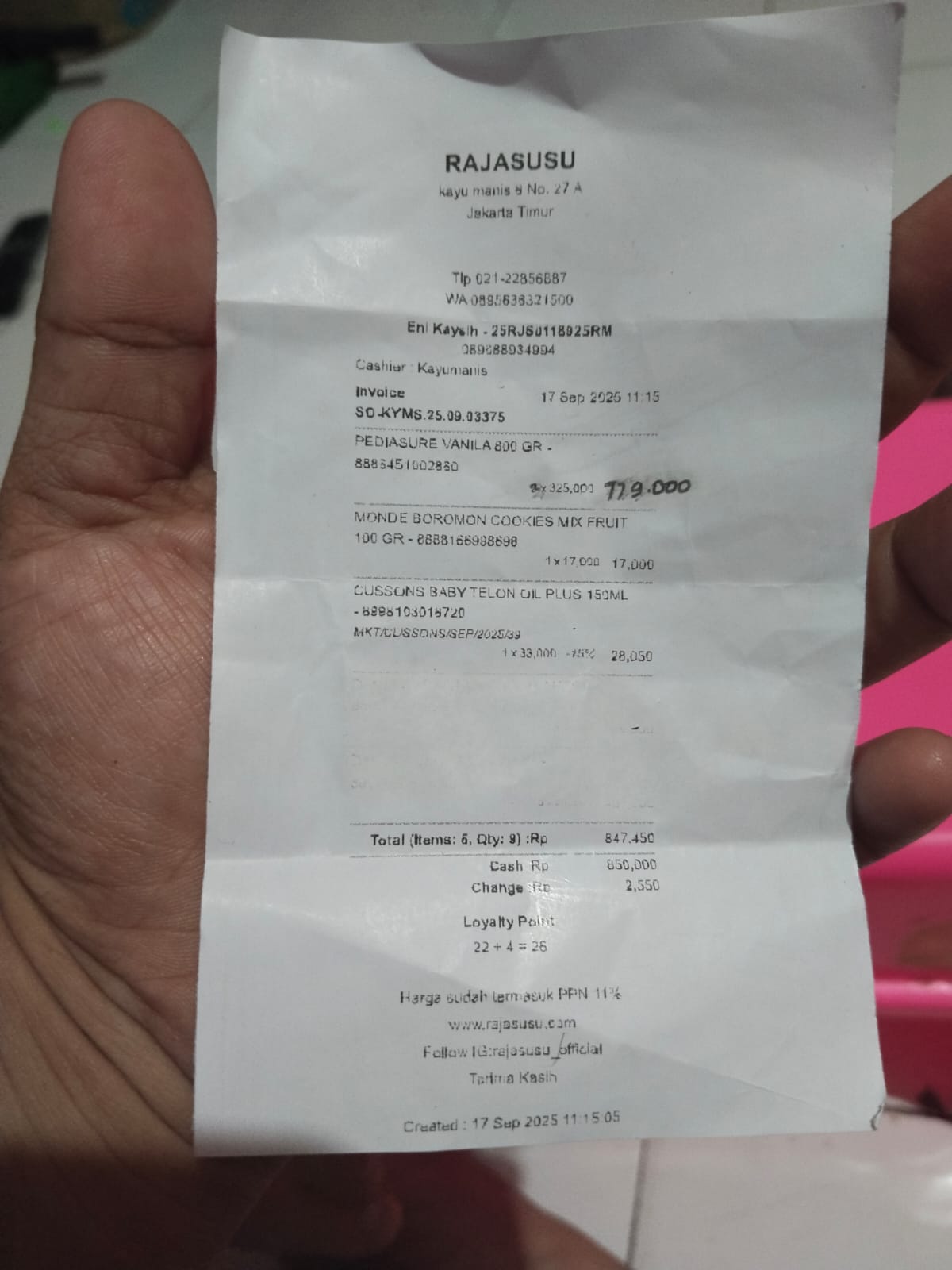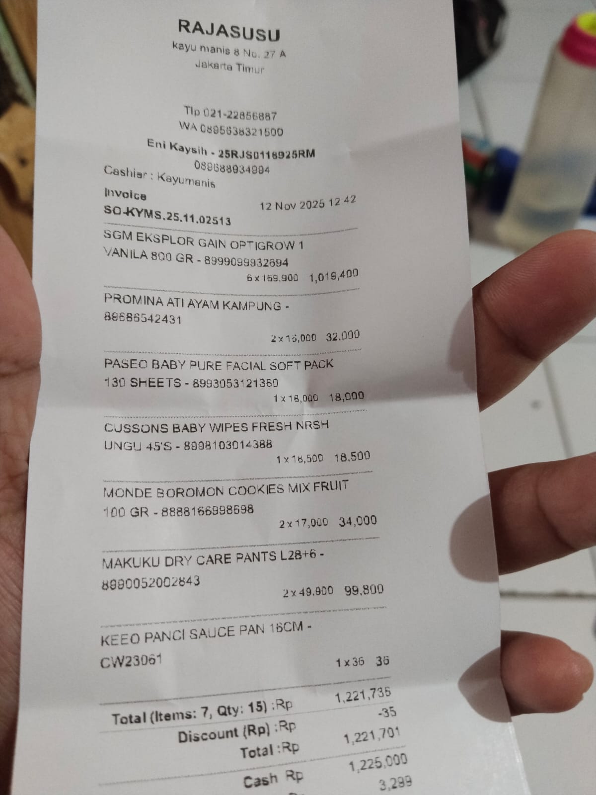 Dana digunakan untuk 1. Susu Pediasur complete Rp325,000 x 2 kaleng = Rp650,000 2. Pampers 2 ball Rp.49.500 x 2 ball = Rp.99.000 3. Minyak telon cussons Rp28.000 4. Sabun cair Rp20.000 5. Biskuit Rp17.000 6. Bubur bayi promina Rp15.000 x 3 duss = Rp45.000 7. Tisu kering Rp. 15.000 8. Transportasi ojek ke RSCM Rp. 50.000 x 8 kali = Rp. 400.0002025-10-06 13:56:16