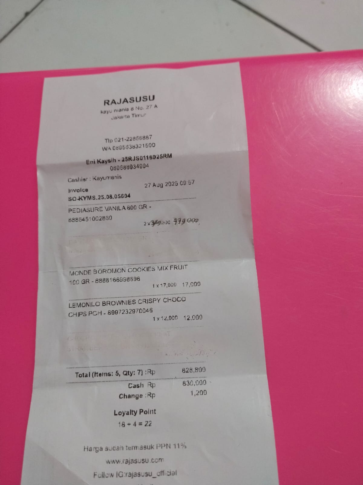 Dana digunakan untuk 1. Susu Pediasur Rp389.500 x 2 kaleng= Rp.779.000 2. Pempers Rp71.900 x 2ball = Rp143.000 3. Biskuit Rp17.000 x 2 = Rp34.000 4. Tisu basah Rp18.000 5. Minyak telon Rp28.0002025-08-12 10:09:12