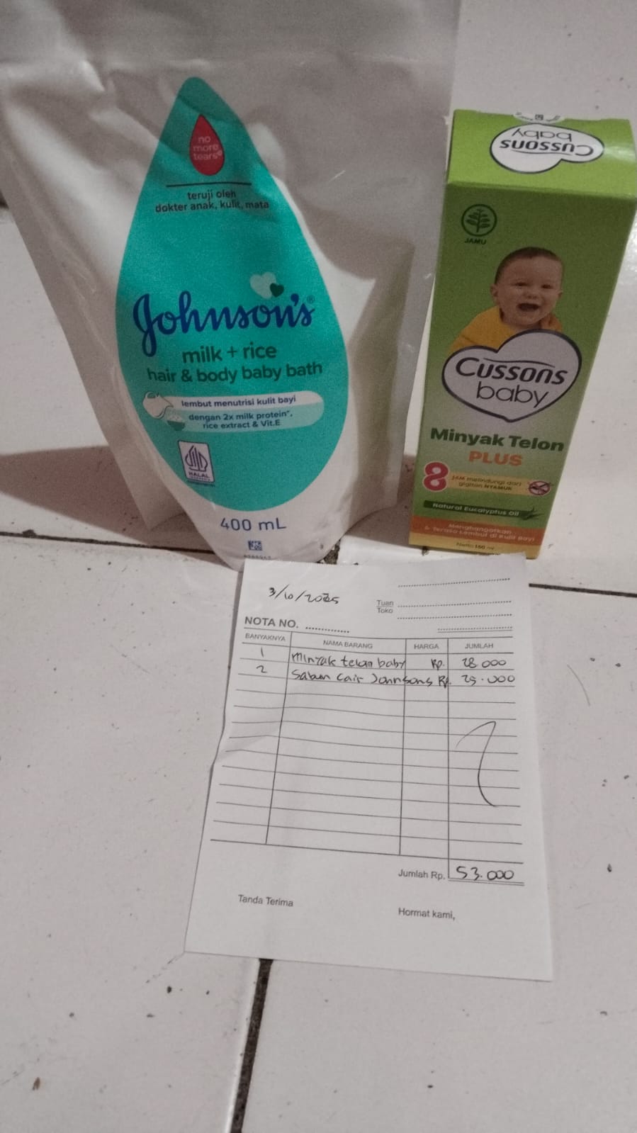 Rp 389.500 x 2 = Rp 779.000Minyak telon Cussons GD = Rp 33.000