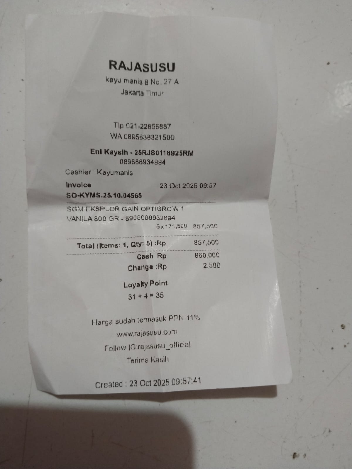 Dana digunakan untuk 1. Susu SGM GEIN OPTIGROW Rp171.500 x 5dus = Rp.857.500 2. Reimburse Vitamin DHA Rp280.500 3. Reimburse Vitamin D3 400 IU Rp68.500 4. Transportasi online ke RSCM Rp50.000 x 4 kali = Rp200.0002025-10-24 16:39:57