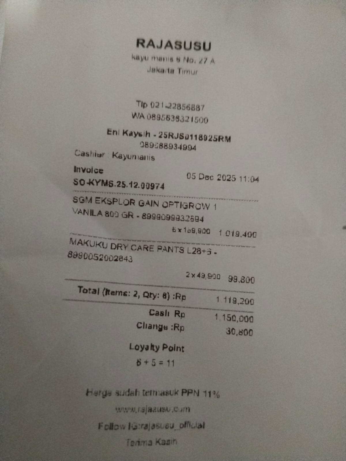 Selain itu, dokter nutrisi juga menyarankan agar Athaya rutin mengonsumsi vitamin DHA dan vitamin D3 supaya tumbuh kembangnya tetap optimal.Adapun kebutuhan Athaya yang telah dibelanjakan adalah sebagai berikut: