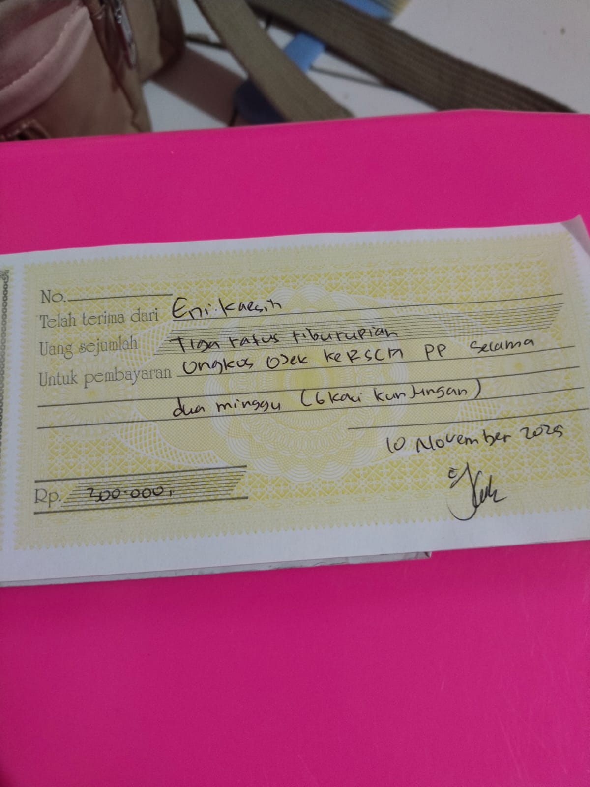 Dana digunakan untuk 1. Susu SGM GEIN OPTIGROW 6 dus Rp171.500,x 6 = Rp1.029.000,- 2. Pampers Rp49.500 x 2 = Rp99.000 3. Transportasi ke RSCM PP selama 3 minggu Rp. 50.000 x 8kali = Rp400.000,2025-12-03 14:11:36
