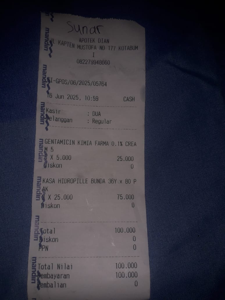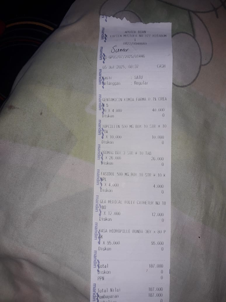 Dana dari TemanBaik aku pakai untuk membeli alat-alat perawatan seperti kassa, kateter, urine bag. Oya mohon maaf ya kalau nota urine bag dan kateternya tidak ada karena hilang.