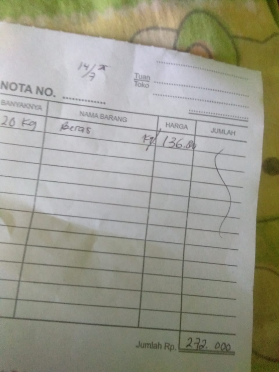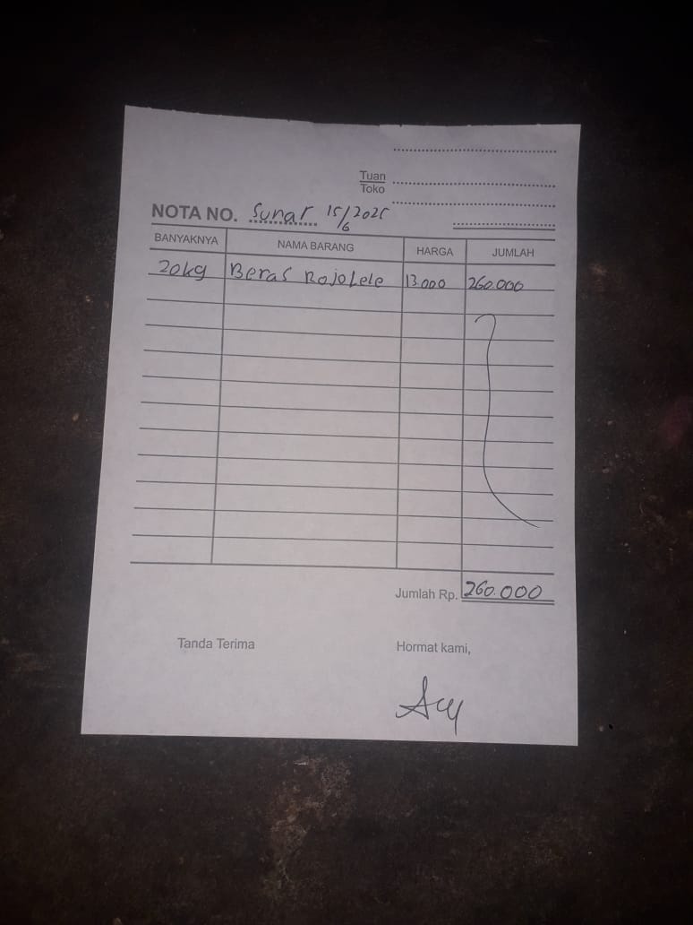 Dana digunakan untuk pembelian Beras Rp14.000 x 15kg = Rp210.0002025-07-14 13:41:32