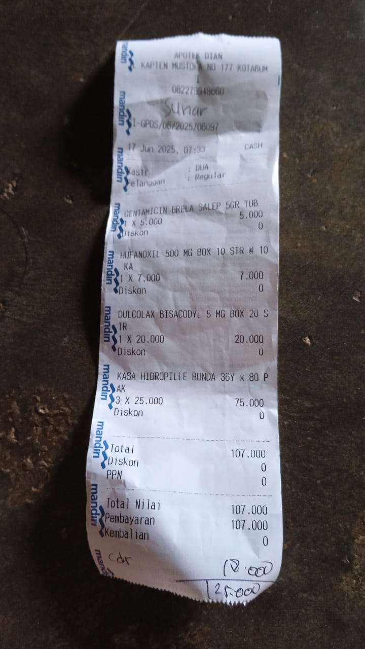 Dana digunakan untuk 1. Kassa 4 gulung Rp120.000 2. Povidone Rp120.000 3. Plaster 10pcs Rp150.000 4. Gentamicin 20tablet Rp100.000 5. Amoxilin 10 strip Rp90.000 6. Beras15 kg Rp200.0002025-06-11 09:35:16