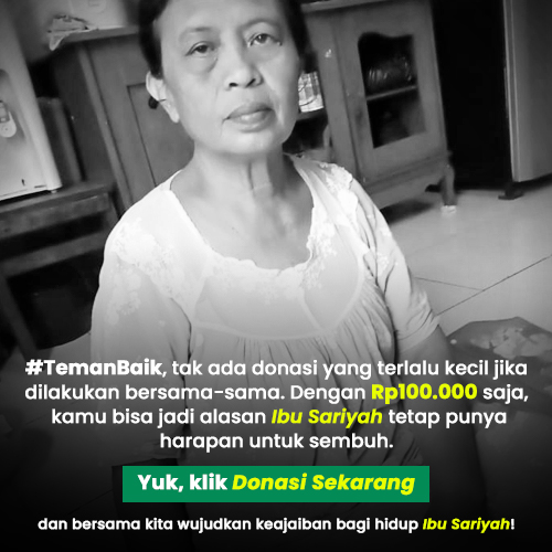 #TemanBaik, tak ada donasi yang terlalu kecil jika dilakukan bersama-sama. Dengan Rp100.000 saja, kita bisa jadi alasan Ibu Sariyah tetap punya harapan untuk sembuh. Yuk, klik Donasi Sekarang dan bersama kita wujudkan keajaiban bagi hidup Ibu Sariyah!