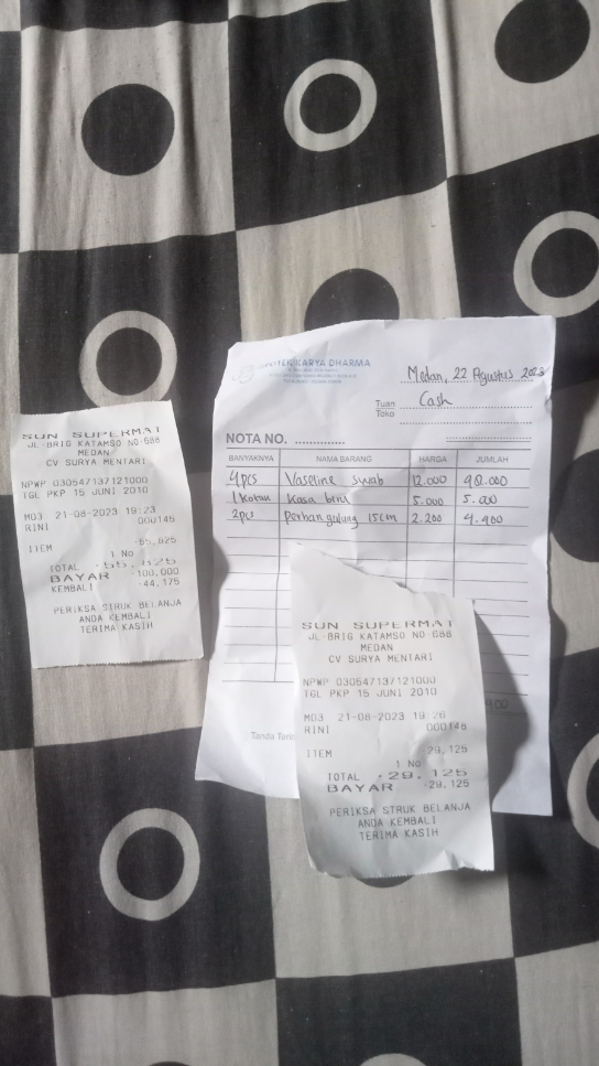 Dana digunakan untuk biaya penggantian pembelian pampers, underpad, vaseline, kassa, dan perban gulung sebesar Rp142.350.2023-08-25 18:03:27