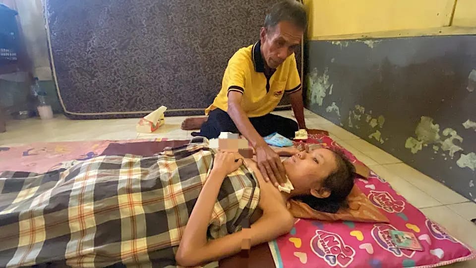 Karena tak ada biaya, aku tidak langsung ke rumah sakit. Akibatnya tumor ini pecah, kemudian selalu bernanah dan digerogoti belatung. Sakit sekali rasanya.