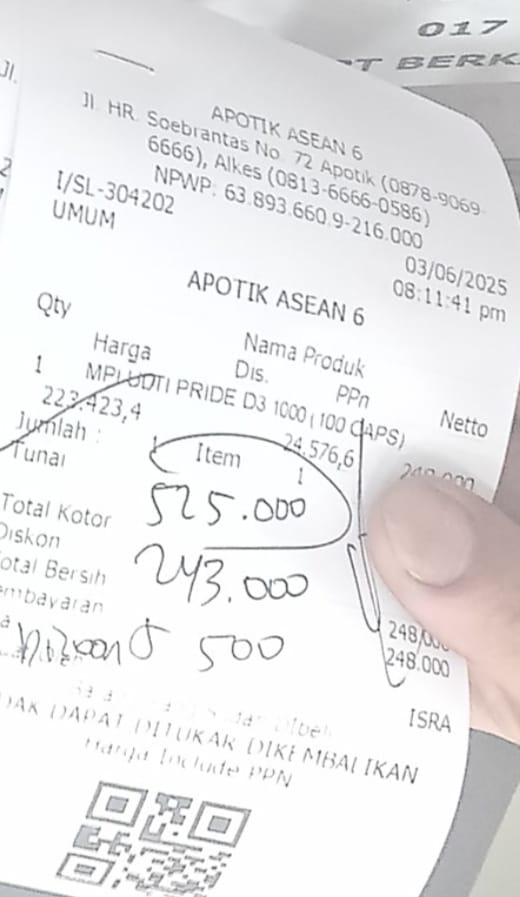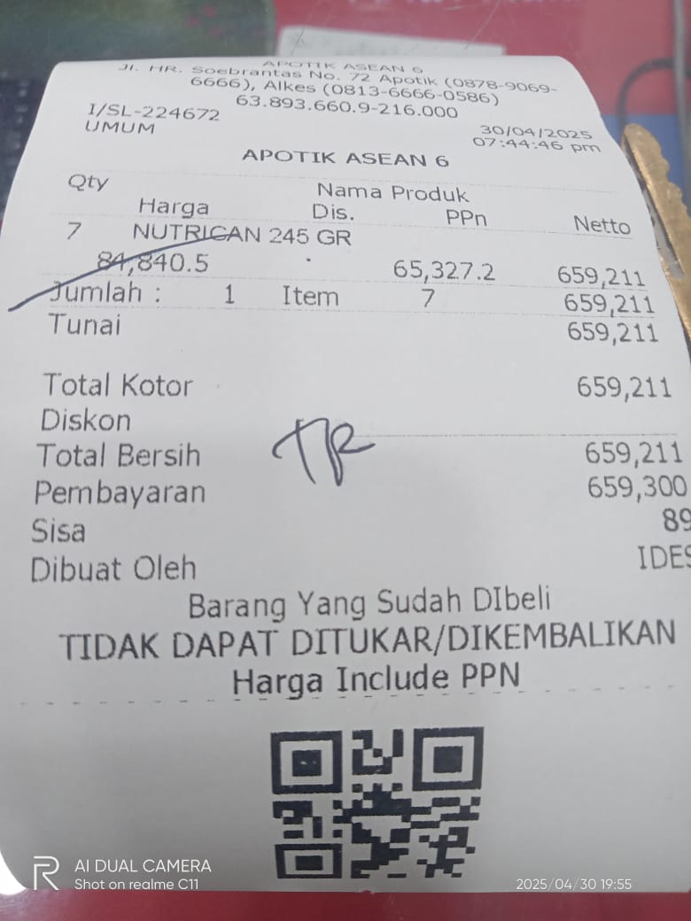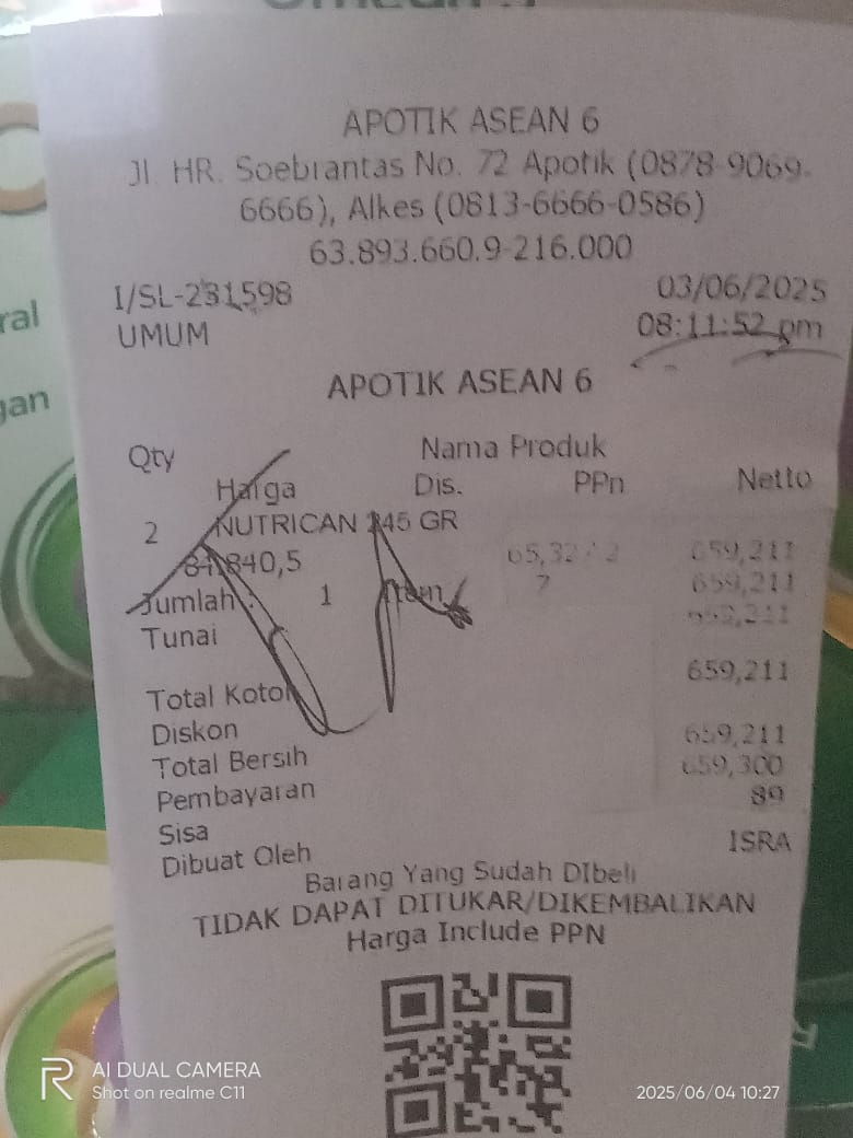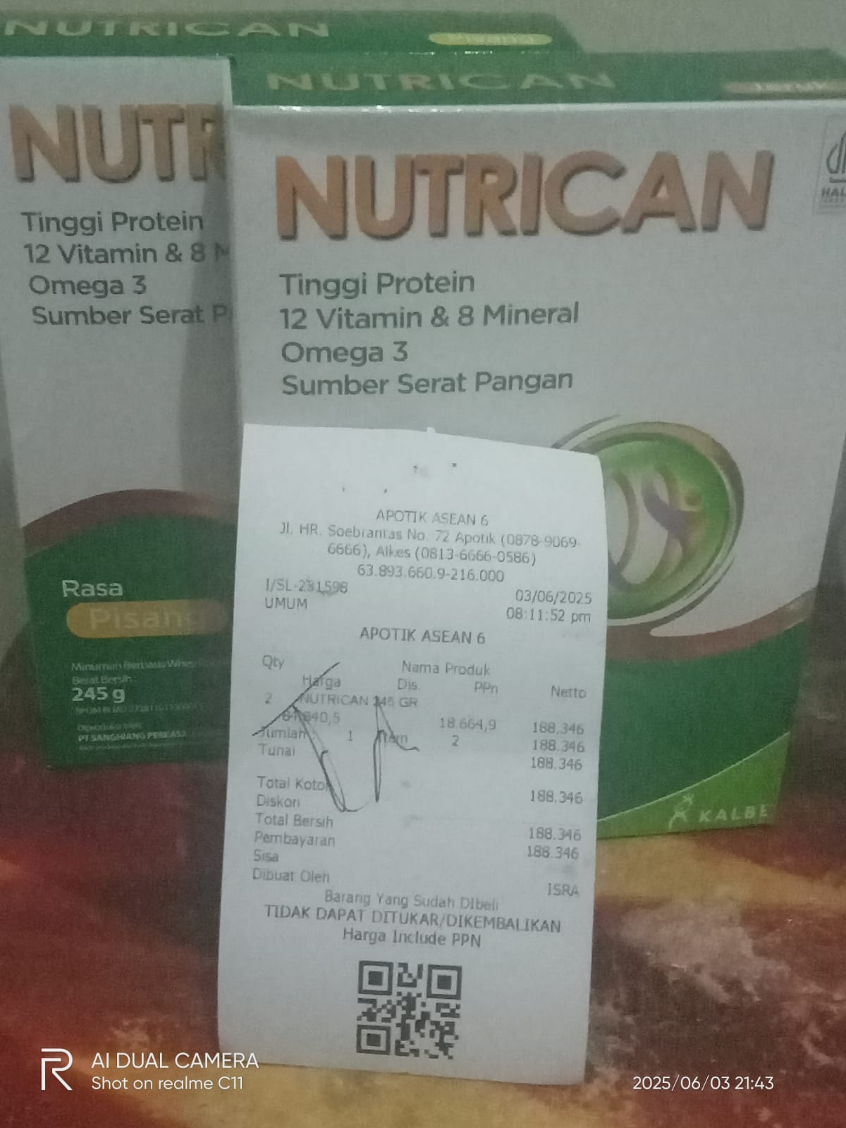 Dana digunakan untuk 1. Susu NUTRICAN Rp85.000 X 7 kotak= Rp595.000 2. Transportasi ke rs Sewa mobil 1Rp110.000 x 15 kali = Rp1.650.000 3. Vitamin cavicur emulsion Rp30.000 X 2 pcs = Rp60.000 4. Obat Imboost force ultimate Rp114. 000 x 10pc =Rp1.140.000