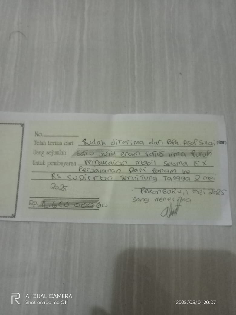 Dana digunakan untuk transportasi ke RS awal bross PP Rp110.000 x 12hari= Rp1.320.0002025-04-10 16:40:25