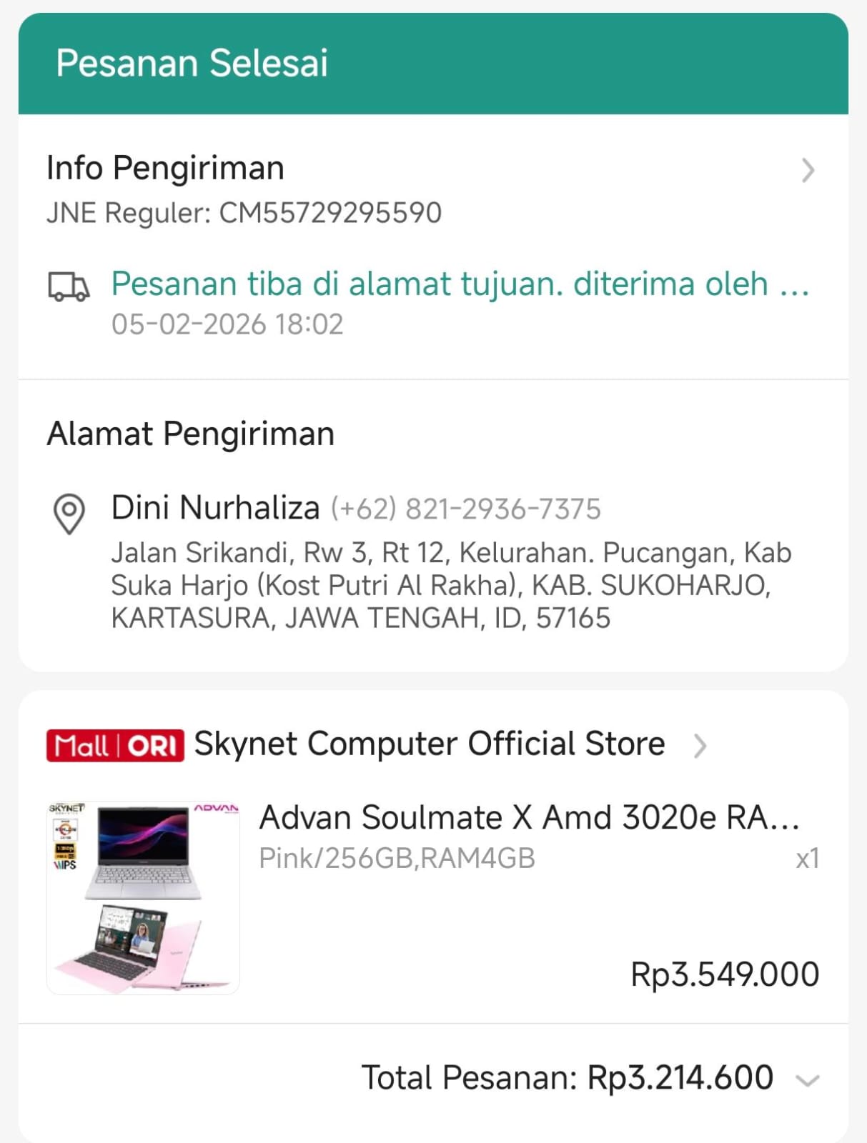 Dana digunakan untuk 1. Bantuan pendidikan berupa pembelian 1 unit laptop kepada Dini Nurhaliza senilai Rp 3.250.000 2. Bantuan pendidikan berupa les bahasa Inggris kepada Innaiya Azkiya senilai Rp 2.000.0002026-01-21 10:20:13